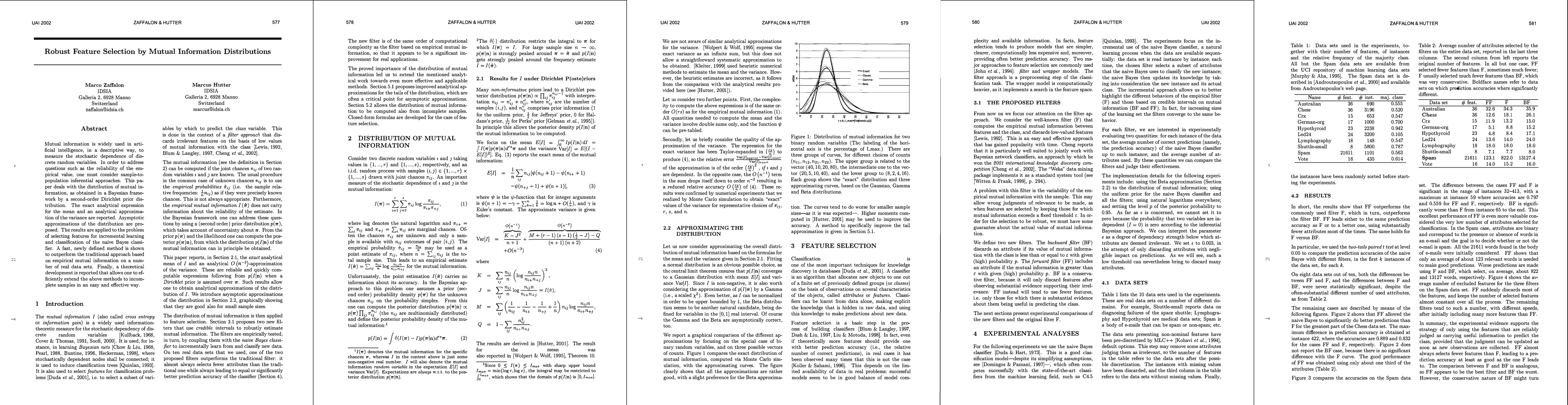 Mutual information is widely used in artificial intelligence, in a descriptive way, to measure the stochastic dependence of discrete random variables. In order to address questions such as the reliability of the empirical value, one must consider sample-to-population inferential approaches. This paper deals with the distribution of mutual information, as obtained in a Bayesian framework by a second-order Dirichlet prior distribution. The exact analytical expression for the mean and an analytical approximation of the variance are reported. Asymptotic approximations of the distribution are proposed. The results are applied to the problem of selecting features for incremental learning and classification of the naive Bayes classifier. A fast, newly defined method is shown to outperform the traditional approach based on empirical mutual information on a number of real data sets. Finally, a theoretical development is reported that allows one to efficiently extend the above methods to incomplete samples in an easy and effective way.