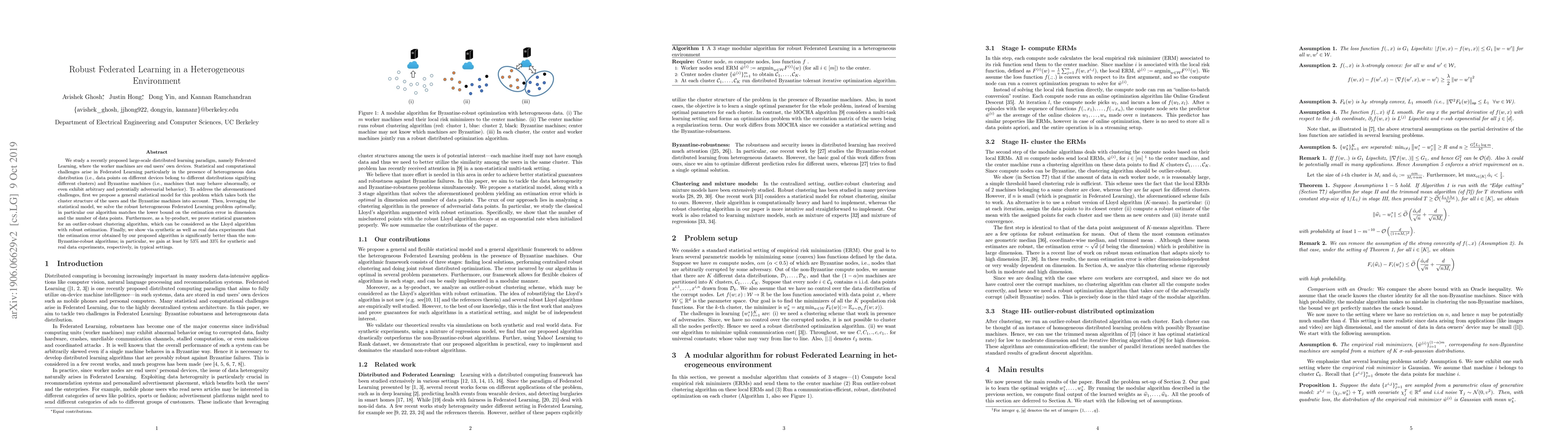 We study a recently proposed large-scale distributed learning paradigm, namely Federated Learning, where the worker machines are end users' own devices. Statistical and computational challenges arise in Federated Learning particularly in the presence of heterogeneous data distribution (i.e., data points on different devices belong to different distributions signifying different clusters) and Byzantine machines (i.e., machines that may behave abnormally, or even exhibit arbitrary and potentially adversarial behavior). To address the aforementioned challenges, first we propose a general statistical model for this problem which takes both the cluster structure of the users and the Byzantine machines into account. Then, leveraging the statistical model, we solve the robust heterogeneous Federated Learning problem \emph{optimally}; in particular our algorithm matches the lower bound on the estimation error in dimension and the number of data points. Furthermore, as a by-product, we prove statistical guarantees for an outlier-robust clustering algorithm, which can be considered as the Lloyd algorithm with robust estimation. Finally, we show via synthetic as well as real data experiments that the estimation error obtained by our proposed algorithm is significantly better than the non-Byzantine-robust algorithms; in particular, we gain at least by 53\% and 33\% for synthetic and real data experiments, respectively, in typical settings.