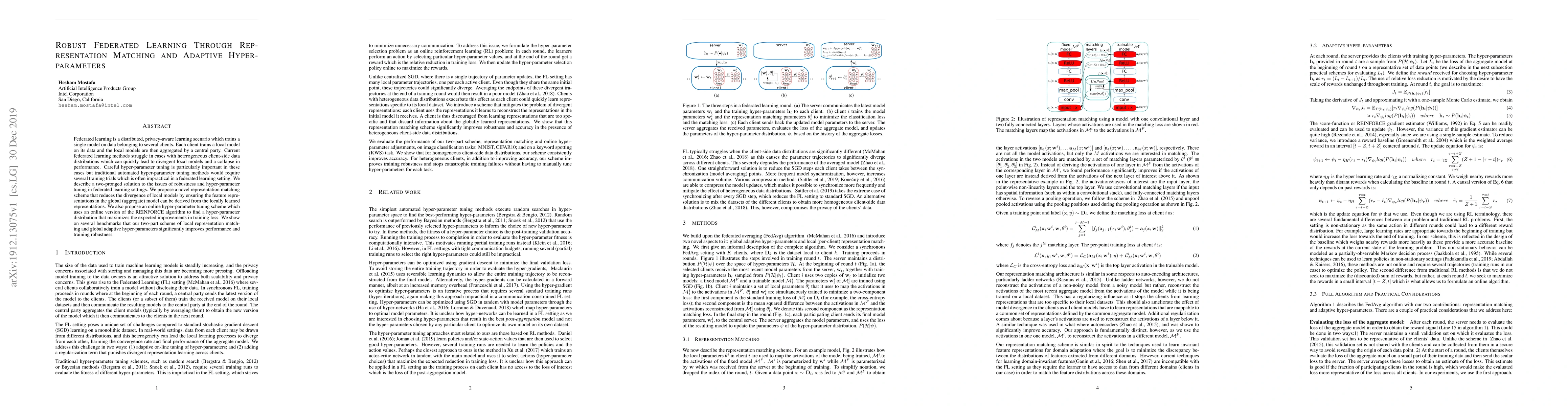 Federated learning is a distributed, privacy-aware learning scenario which trains a single model on data belonging to several clients. Each client trains a local model on its data and the local models are then aggregated by a central party. Current federated learning methods struggle in cases with heterogeneous client-side data distributions which can quickly lead to divergent local models and a collapse in performance. Careful hyper-parameter tuning is particularly important in these cases but traditional automated hyper-parameter tuning methods would require several training trials which is often impractical in a federated learning setting. We describe a two-pronged solution to the issues of robustness and hyper-parameter tuning in federated learning settings. We propose a novel representation matching scheme that reduces the divergence of local models by ensuring the feature representations in the global (aggregate) model can be derived from the locally learned representations. We also propose an online hyper-parameter tuning scheme which uses an online version of the REINFORCE algorithm to find a hyper-parameter distribution that maximizes the expected improvements in training loss. We show on several benchmarks that our two-part scheme of local representation matching and global adaptive hyper-parameters significantly improves performance and training robustness.