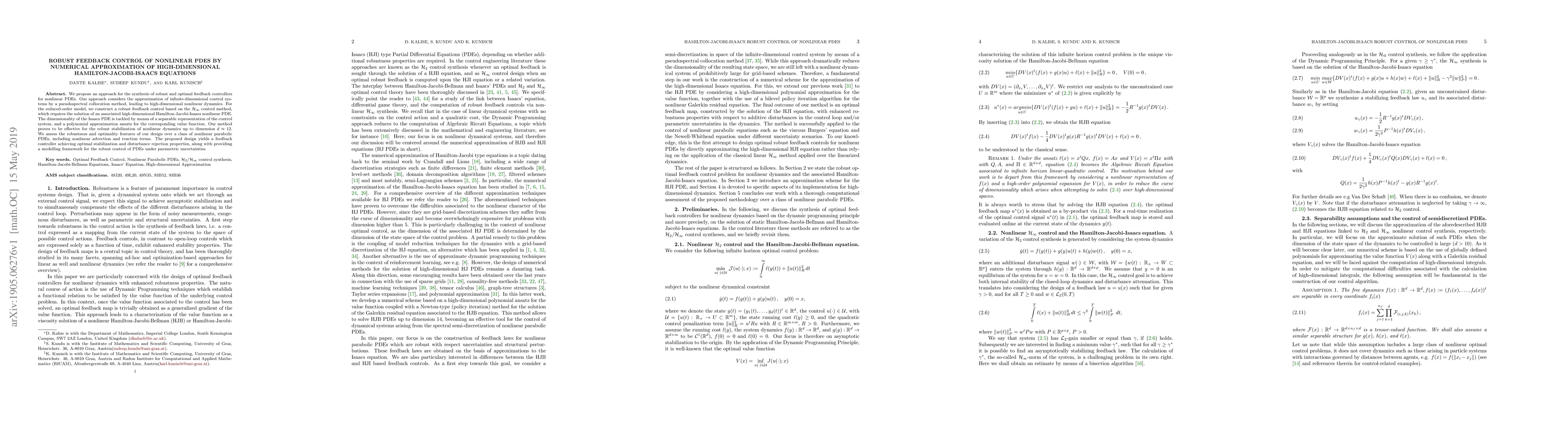 This paper proposes an approach for robust and optimal feedback control of nonlinear partial differential equations (PDEs) using a pseudospectral collocation method to approximate high-dimensional dynamics. The method constructs a robust controller based on $\cH_{\infty}$ control, solving a high-dimensional Hamilton-Jacobi-Isaacs equation, and demonstrates effectiveness up to dimension $d\approx 12$.