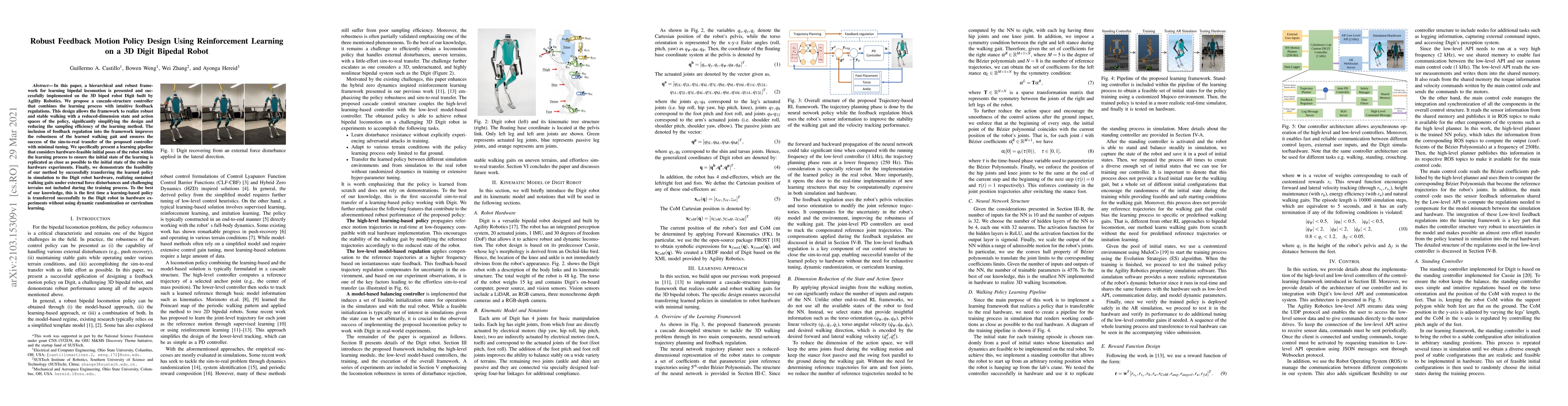 In this paper, a hierarchical and robust framework for learning bipedal locomotion is presented and successfully implemented on the 3D biped robot Digit built by Agility Robotics. We propose a cascade-structure controller that combines the learning process with intuitive feedback regulations. This design allows the framework to realize robust and stable walking with a reduced-dimension state and action spaces of the policy, significantly simplifying the design and reducing the sampling efficiency of the learning method. The inclusion of feedback regulation into the framework improves the robustness of the learned walking gait and ensures the success of the sim-to-real transfer of the proposed controller with minimal tuning. We specifically present a learning pipeline that considers hardware-feasible initial poses of the robot within the learning process to ensure the initial state of the learning is replicated as close as possible to the initial state of the robot in hardware experiments. Finally, we demonstrate the feasibility of our method by successfully transferring the learned policy in simulation to the Digit robot hardware, realizing sustained walking gaits under external force disturbances and challenging terrains not included during the training process. To the best of our knowledge, this is the first time a learning-based policy is transferred successfully to the Digit robot in hardware experiments without using dynamic randomization or curriculum learning.