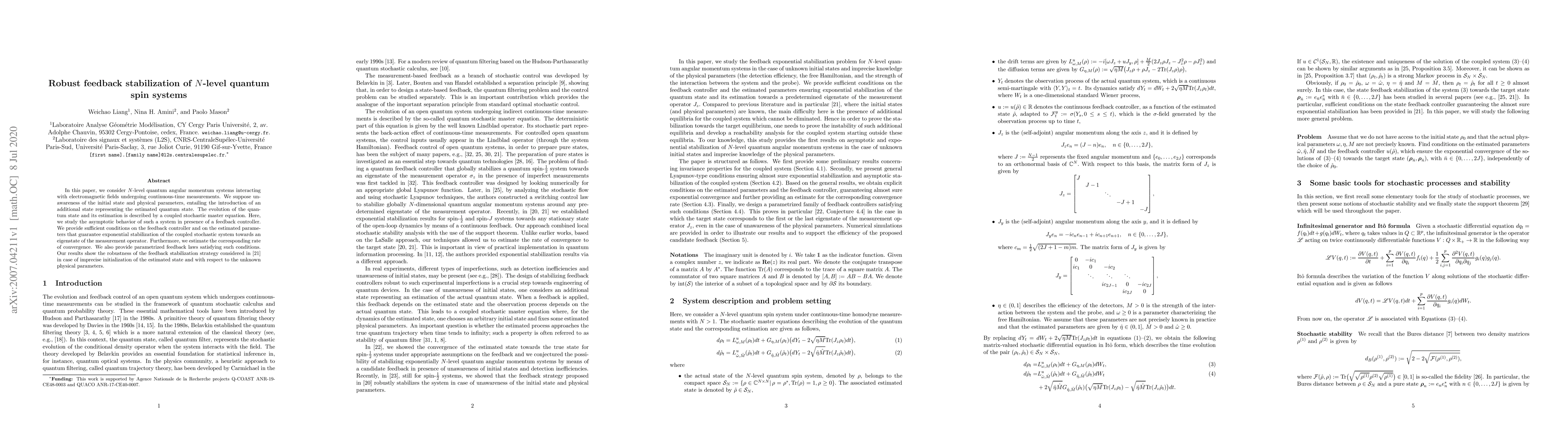 In this paper, we consider N-level quantum angular momentum systems interacting with electromagnetic fields undergoing continuous-time measurements. We suppose unawareness of the initial state and physical parameters, entailing the introduction of an additional state representing the estimated quantum state. The evolution of the quantum state and its estimation is described by a coupled stochastic master equation. Here, we study the asymptotic behavior of such a system in presence of a feedback controller. We provide sufficient conditions on the feedback controller and on the estimated parameters that guarantee exponential stabilization of the coupled stochastic system towards an eigenstate of the measurement operator. Furthermore, we estimate the corresponding rate of convergence. We also provide parametrized feedback laws satisfying such conditions. Our results show the robustness of the feedback stabilization strategy considered in [21] in case of imprecise initialization of the estimated state and with respect to the unknown physical parameters.