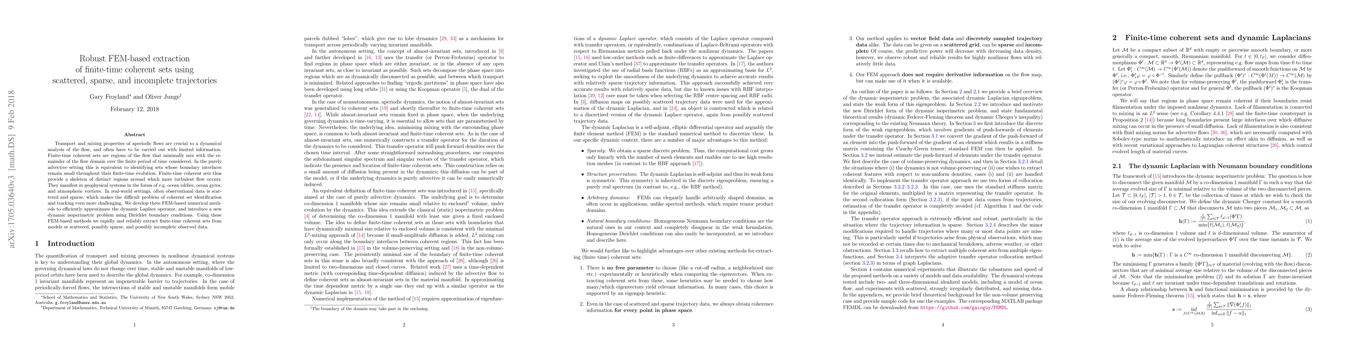 Transport and mixing properties of aperiodic flows are crucial to a dynamical analysis of the flow, and often have to be carried out with limited information. Finite-time coherent sets are regions of the flow that minimally mix with the remainder of the flow domain over the finite period of time considered. In the purely advective setting this is equivalent to identifying sets whose boundary interfaces remain small throughout their finite-time evolution. Finite-time coherent sets thus provide a skeleton of distinct regions around which more turbulent flow occurs. They manifest in geophysical systems in the forms of e.g.\ ocean eddies, ocean gyres, and atmospheric vortices. In real-world settings, often observational data is scattered and sparse, which makes the difficult problem of coherent set identification and tracking even more challenging. We develop three FEM-based numerical methods to efficiently approximate the dynamic Laplace operator, and introduce a new dynamic isoperimetric problem using Dirichlet boundary conditions. Using these FEM-based methods we rapidly and reliably extract finite-time coherent sets from models or scattered, possibly sparse, and possibly incomplete observed data.