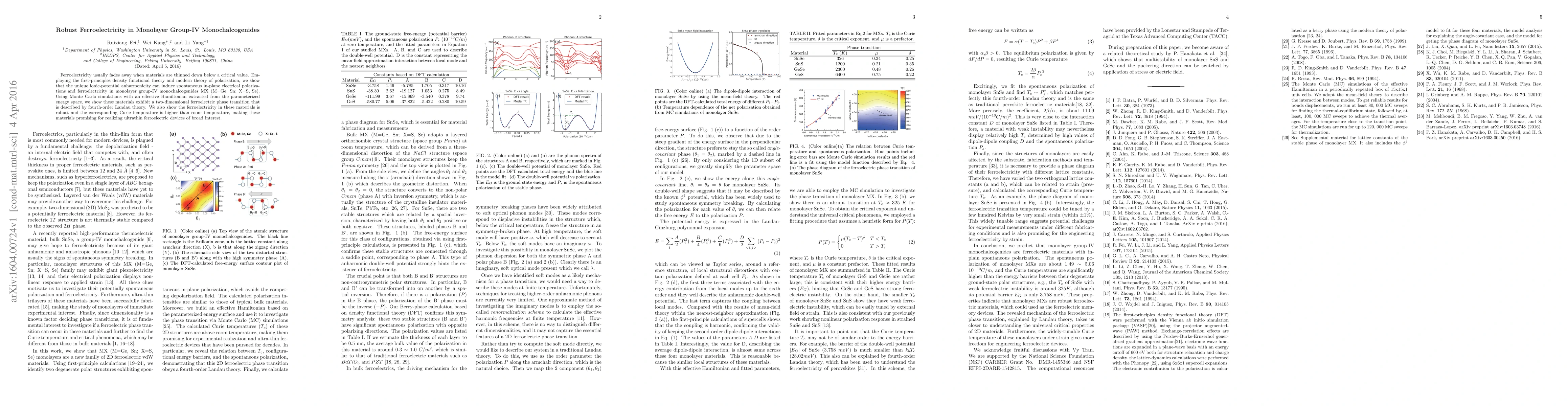 This paper demonstrates that monolayer group-IV monochalcogenides exhibit ferroelectricity due to unique ionic-potential anharmonicity, with a robust two-dimensional ferroelectric phase transition and Curie temperatures above room temperature, making them promising for ultra-thin ferroelectric devices.