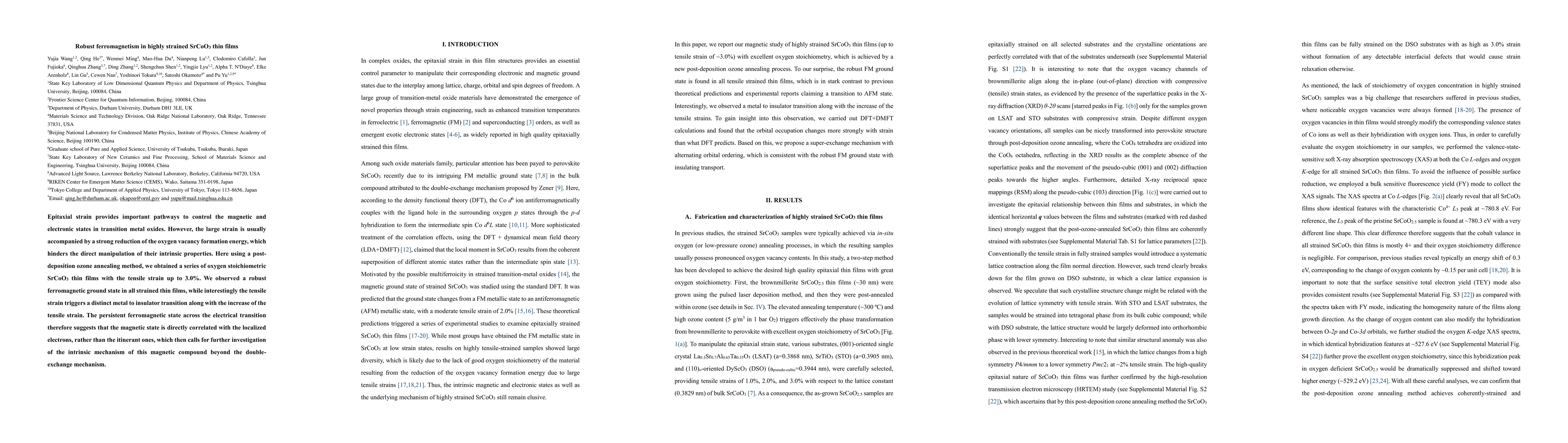 This study demonstrates robust ferromagnetism in SrCoO3 thin films under tensile strain up to 3.0% achieved via post-deposition ozone annealing, maintaining oxygen stoichiometry. Notably, the films exhibit a metal-to-insulator transition with increased strain, indicating the magnetic state is linked to localized rather than itinerant electrons.