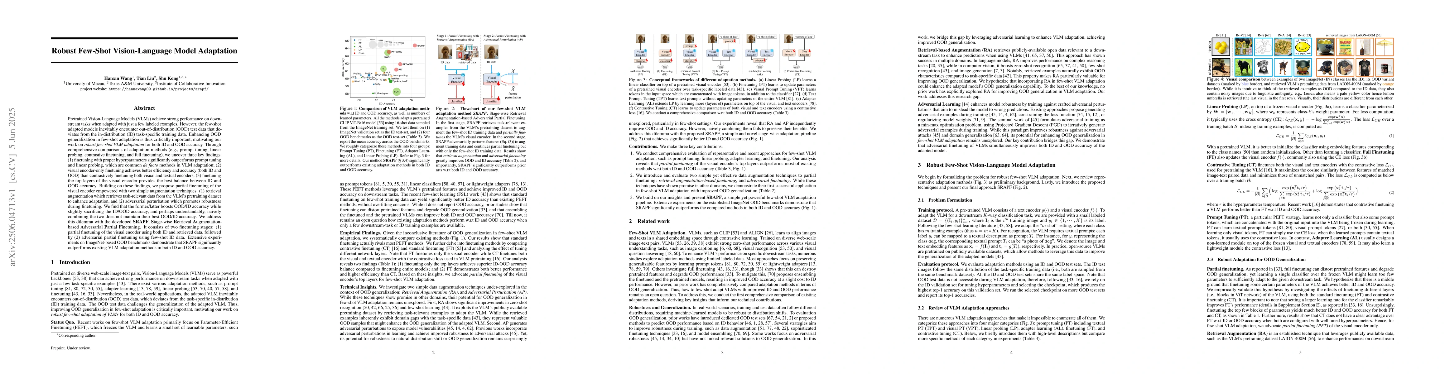A new method called SRAPF improves few-shot vision-language model adaptation by combining partial finetuning with two augmentation techniques, achieving state-of-the-art accuracy on out-of-distribution tasks.