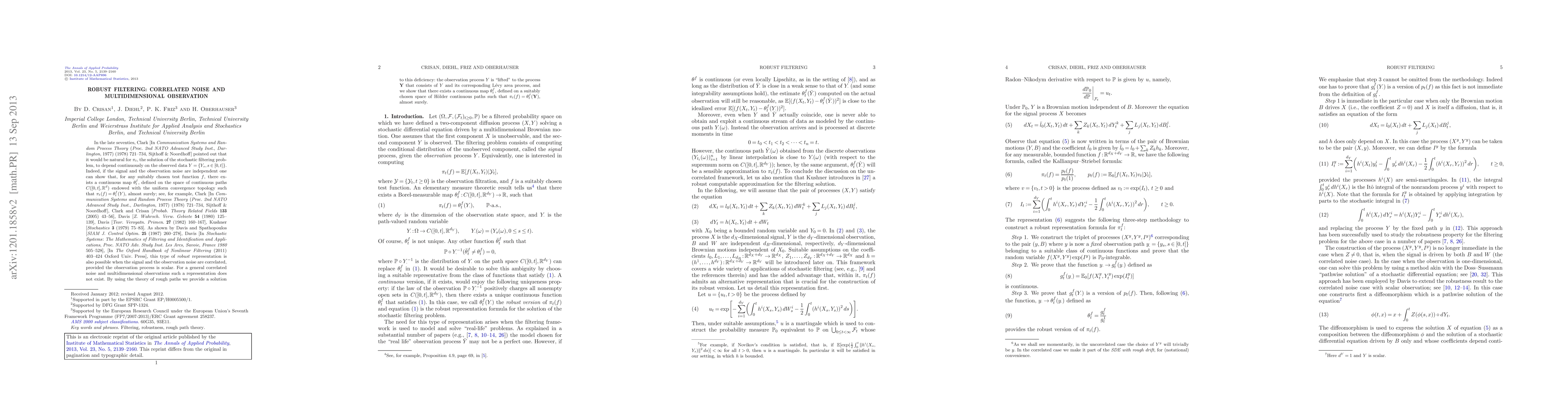 In the late seventies, Clark [In Communication Systems and Random Process Theory (Proc. 2nd NATO Advanced Study Inst., Darlington, 1977) (1978) 721-734, Sijthoff & Noordhoff] pointed out that it would be natural for $\pi_t$, the solution of the stochastic filtering problem, to depend continuously on the observed data $Y=\{Y_s,s\in[0,t]\}$. Indeed, if the signal and the observation noise are independent one can show that, for any suitably chosen test function $f$, there exists a continuous map $\theta^f_t$, defined on the space of continuous paths $C([0,t],\mathbb{R}^d)$ endowed with the uniform convergence topology such that $\pi_t(f)=\theta^f_t(Y)$, almost surely; see, for example, Clark [In Communication Systems and Random Process Theory (Proc. 2nd NATO Advanced Study Inst., Darlington, 1977) (1978) 721-734, Sijthoff & Noordhoff], Clark and Crisan [Probab. Theory Related Fields 133 (2005) 43-56], Davis [Z. Wahrsch. Verw. Gebiete 54 (1980) 125-139], Davis [Teor. Veroyatn. Primen. 27 (1982) 160-167], Kushner [Stochastics 3 (1979) 75-83]. As shown by Davis and Spathopoulos [SIAM J. Control Optim. 25 (1987) 260-278], Davis [In Stochastic Systems: The Mathematics of Filtering and Identification and Applications, Proc. NATO Adv. Study Inst. Les Arcs, Savoie, France 1980 505-528], [In The Oxford Handbook of Nonlinear Filtering (2011) 403-424 Oxford Univ. Press], this type of robust representation is also possible when the signal and the observation noise are correlated, provided the observation process is scalar. For a general correlated noise and multidimensional observations such a representation does not exist. By using the theory of rough paths we provide a solution to this deficiency: the observation process $Y$ is "lifted" to the process $\mathbf{Y}$ that consists of $Y$ and its corresponding L\'{e}vy area process, and we show that there exists a continuous map $\theta_t^f$, defined on a suitably chosen space of H\"{o}lder continuous paths such that $\pi_t(f)=\theta_t^f(\mathbf{Y})$, almost surely.