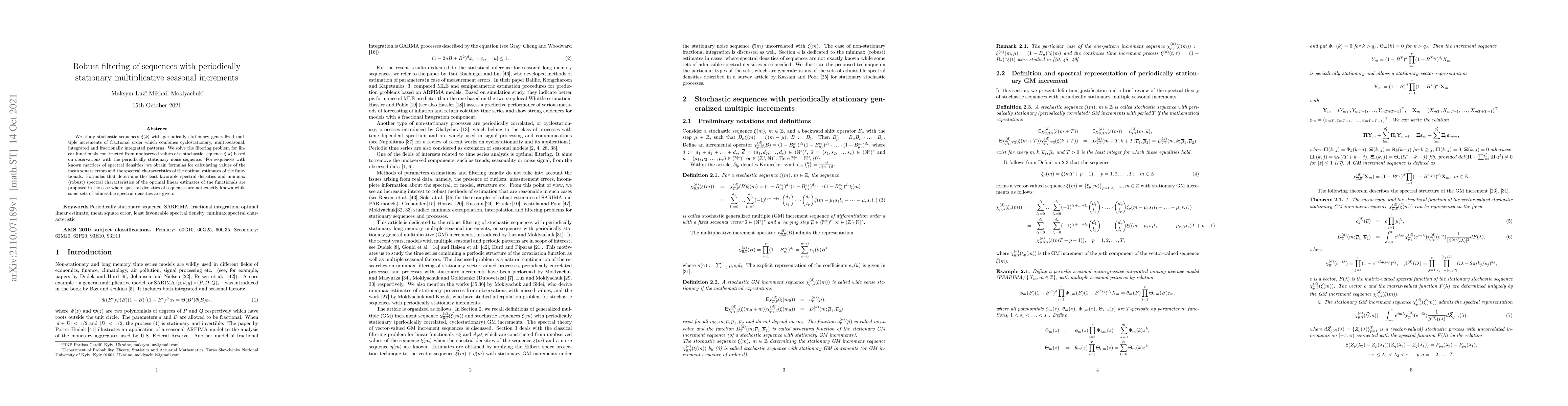 This paper addresses filtering for stochastic sequences with complex, periodically stationary, and multiplicative seasonal increments. It provides optimal estimation formulas for linear functionals based on observed data, including robust solutions for scenarios with uncertain spectral densities.