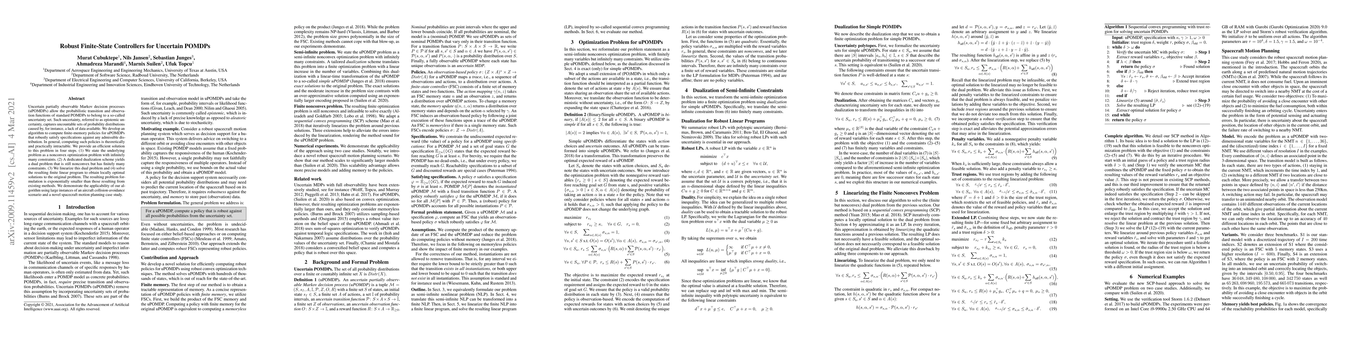 This research presents an efficient algorithm for computing finite-memory policies in Uncertain Partially Observable Markov Decision Processes (uPOMDPs). It transforms the intractable nonconvex optimization problem with infinitely many constraints into a finite linear program, making it solvable. The method is demonstrated effective in aircraft collision-avoidance and spacecraft motion planning scenarios.