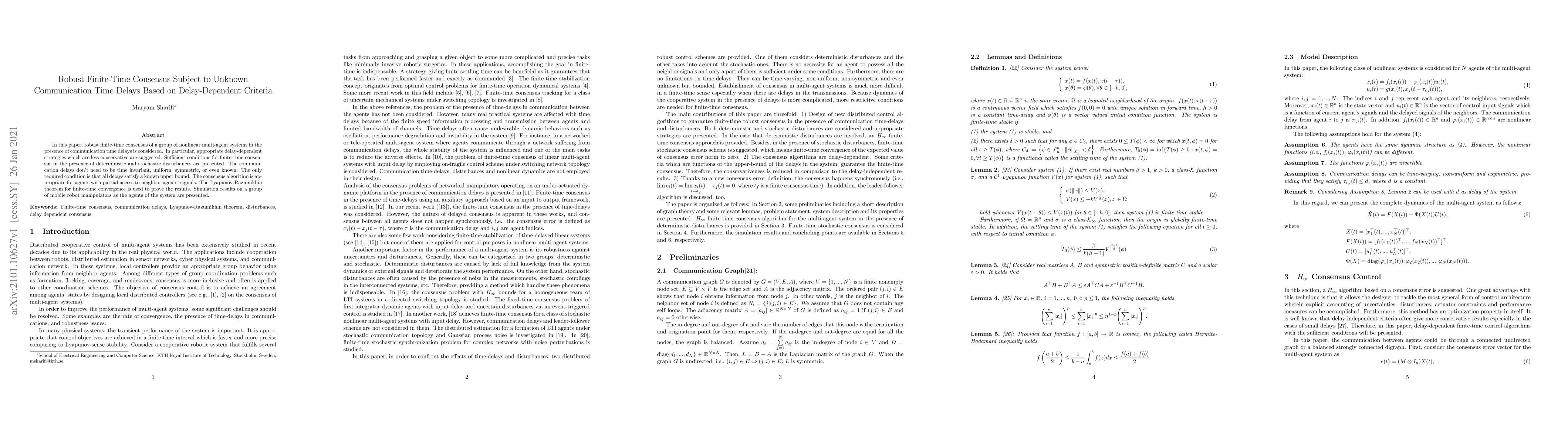 This paper proposes robust finite-time consensus strategies for nonlinear multi-agent systems with unknown communication time delays, using delay-dependent criteria. It presents sufficient conditions for consensus under deterministic and stochastic disturbances, without requiring time-invariant, uniform, or symmetric delays, only an upper bound. Simulation results on mobile robot manipulators demonstrate the effectiveness of the proposed algorithm.