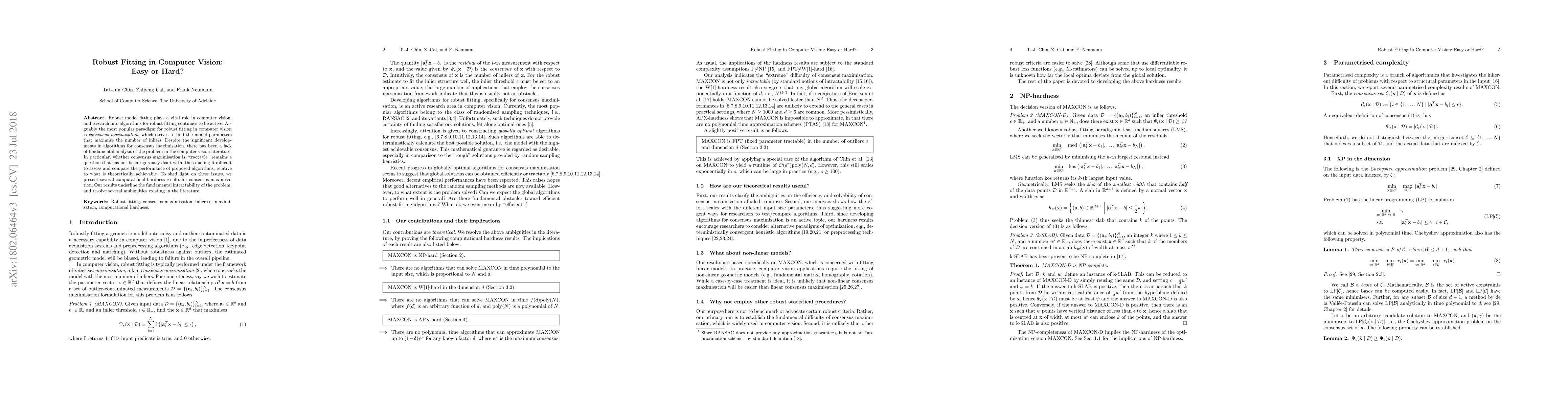 This paper investigates the computational complexity of robust model fitting in computer vision, focusing on consensus maximisation. It reveals the inherent intractability of the problem, providing computational hardness results that clarify ambiguities in existing literature and assess the theoretical limits of algorithms.