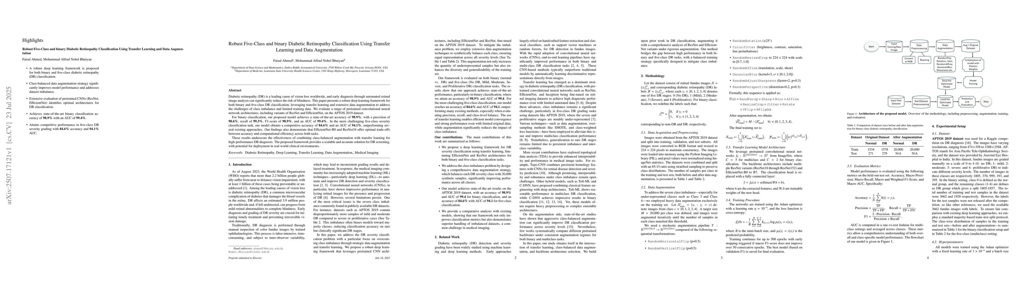 Diabetic retinopathy (DR) is a leading cause of vision loss worldwide, and early diagnosis through automated retinal image analysis can significantly reduce the risk of blindness. This paper presents a robust deep learning framework for both binary and five-class DR classification, leveraging transfer learning and extensive data augmentation to address the challenges of class imbalance and limited training data. We evaluate a range of pretrained convolutional neural network architectures, including variants of ResNet and EfficientNet, on the APTOS 2019 dataset. For binary classification, our proposed model achieves a state-of-the-art accuracy of 98.9%, with a precision of 98.6%, recall of 99.3%, F1-score of 98.9%, and an AUC of 99.4%. In the more challenging five-class severity classification task, our model obtains a competitive accuracy of 84.6% and an AUC of 94.1%, outperforming several existing approaches. Our findings also demonstrate that EfficientNet-B0 and ResNet34 offer optimal trade-offs between accuracy and computational efficiency across both tasks. These results underscore the effectiveness of combining class-balanced augmentation with transfer learning for high-performance DR diagnosis. The proposed framework provides a scalable and accurate solution for DR screening, with potential for deployment in real-world clinical environments.