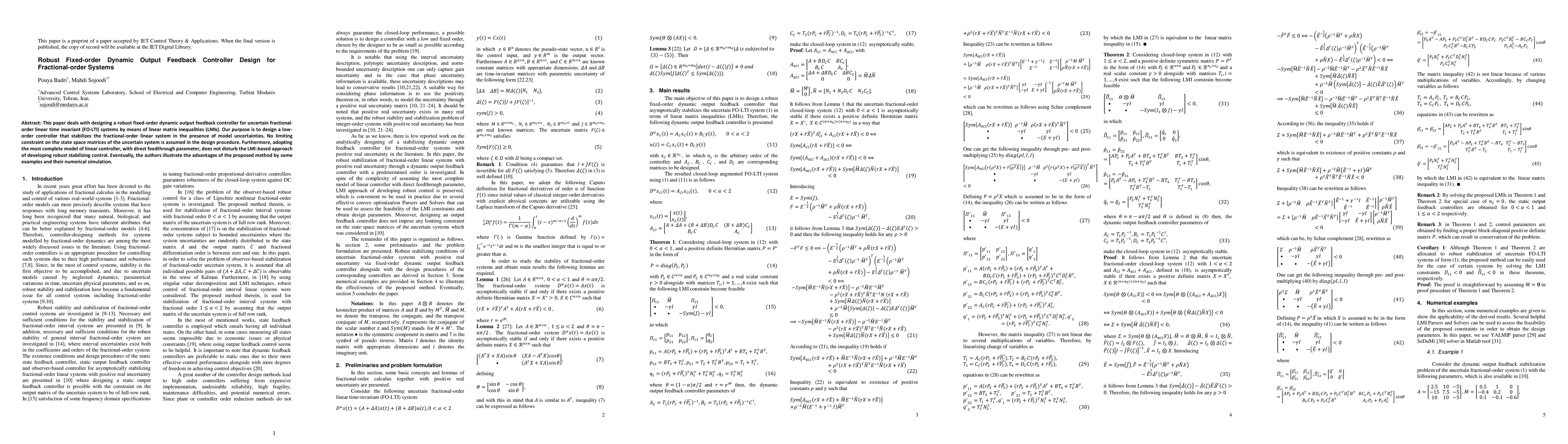 This paper presents a method for designing a robust fixed-order dynamic output feedback controller for uncertain fractional-order linear time-invariant systems using linear matrix inequalities (LMIs). The proposed controller stabilizes the system despite model uncertainties without restrictive constraints on the system matrices.