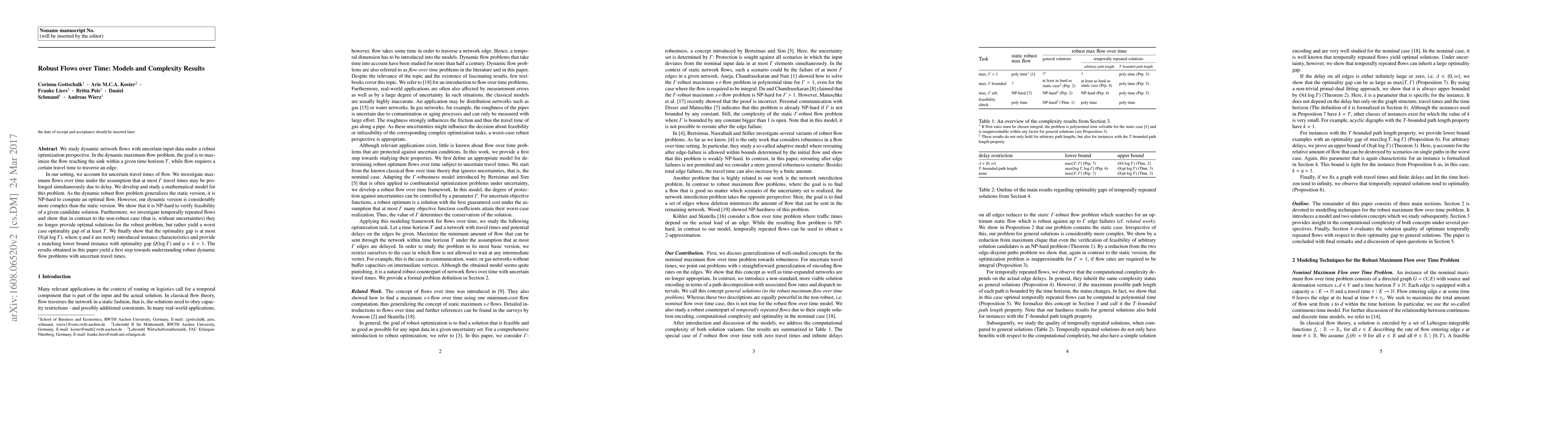 Researchers study dynamic network flows with uncertain travel times to maximize flow within a given time horizon, finding that it's NP-hard to verify feasibility of solutions and the optimality gap is at most $O( heta k ext{log} T)$.