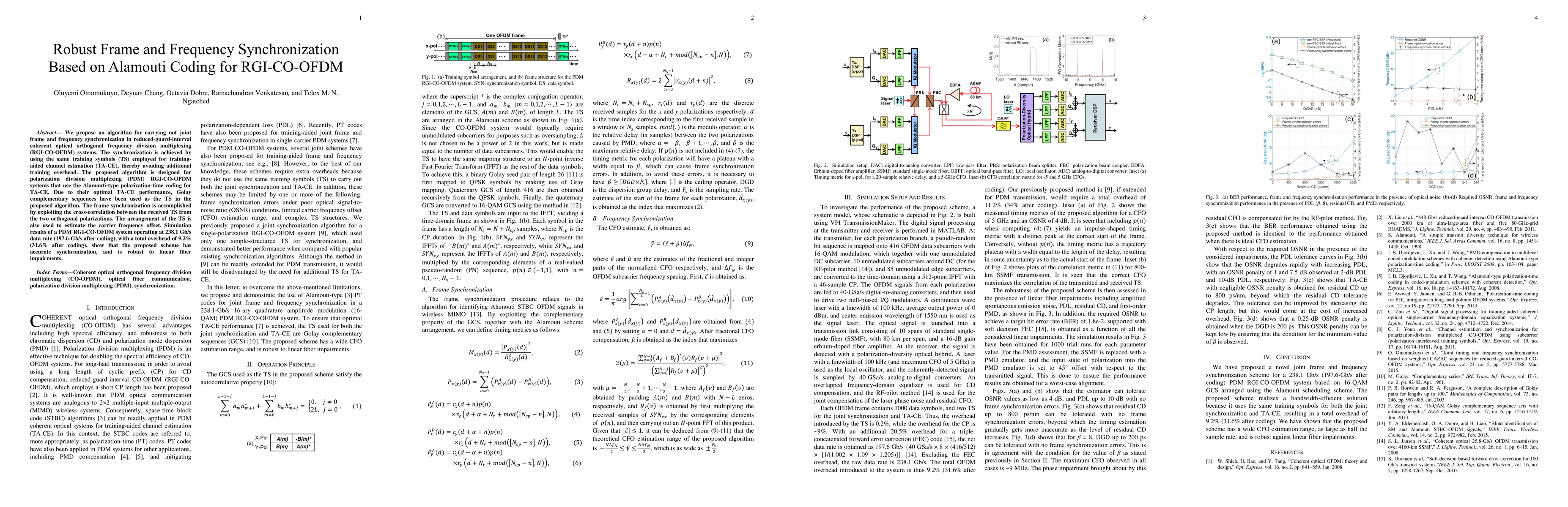 This paper proposes an algorithm for joint frame and frequency synchronization in RGI-CO-OFDM systems using Alamouti coding, minimizing training overhead. The method leverages Golay complementary sequences for optimal channel estimation and employs cross-correlation for frame synchronization, demonstrating robust performance under linear fiber impairments.