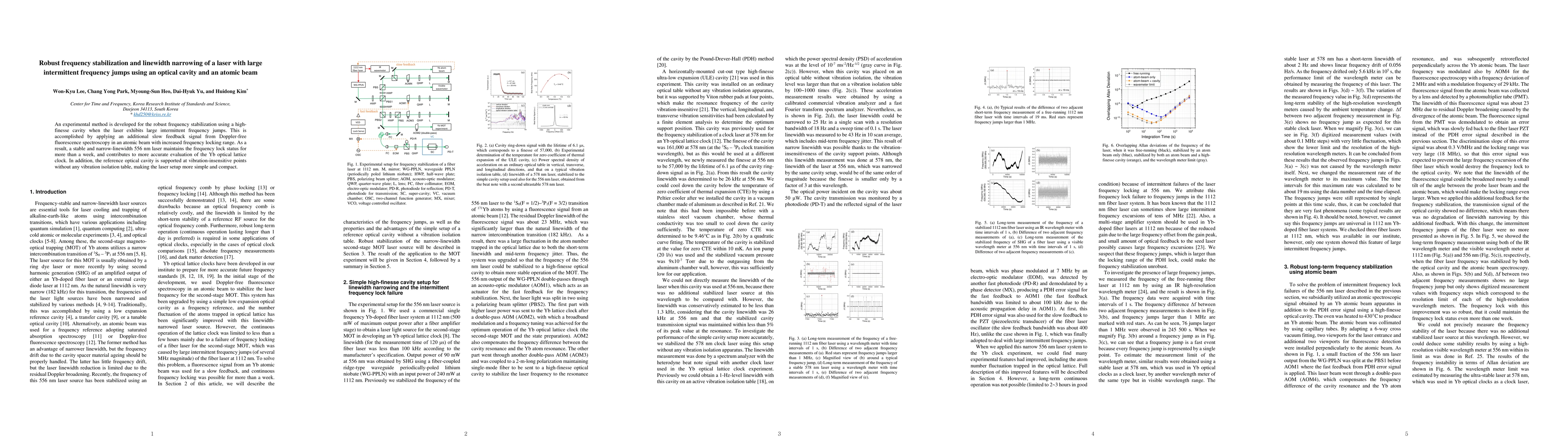 This paper presents a method for stabilizing the frequency of a 556 nm laser with large intermittent frequency jumps using a high-finesse optical cavity and an atomic beam, achieving narrow linewidth and stability for over a week. The setup avoids the need for vibration isolation tables, simplifying and compacting the laser system.