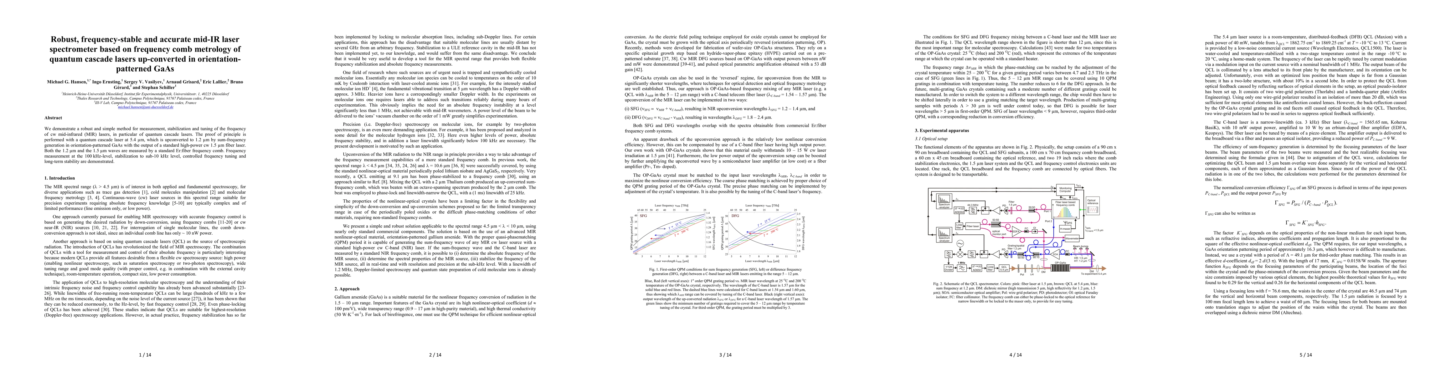 We demonstrate a robust and simple method for measurement, stabilization and tuning of the frequency of cw mid-infrared (MIR) lasers, in particular of quantum cascade lasers. The proof of principle is performed with a quantum cascade laser at 5.4 \mu m, which is upconverted to 1.2 \mu m by sum-frequency generation in orientation-patterned GaAs with the output of a standard high-power cw 1.5 \mu m fiber laser. Both the 1.2 \mu m and the 1.5 \mu m waves are measured by a standard Er:fiber frequency comb. Frequency measurement at the 100 kHz-level, stabilization to sub-10 kHz level, controlled frequency tuning and long-term stability are demonstrated.