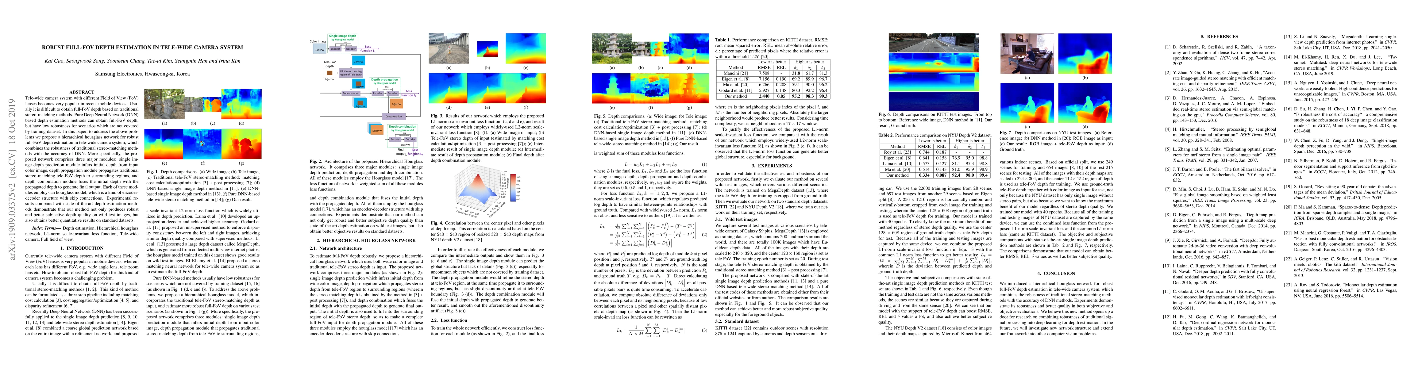 The paper presents a hierarchical hourglass network with a novel loss function for robust full-FoV depth estimation in tele-wide camera systems, combining traditional stereo-matching methods and DNNs.