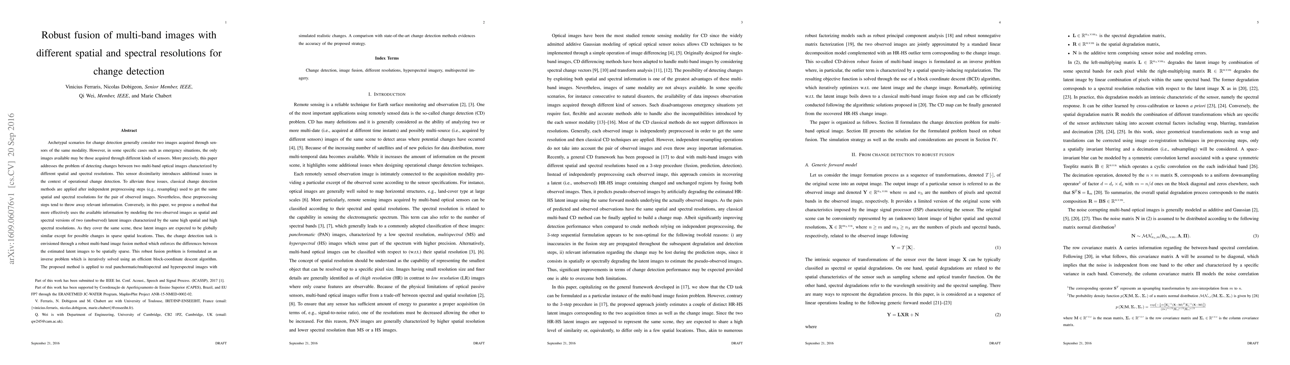 This paper proposes a robust fusion method for detecting changes between multi-band optical images with different spatial and spectral resolutions. It models the images as versions of latent high-resolution images and uses an inverse problem approach to identify spatially sparse differences, outperforming traditional preprocessing-based methods.