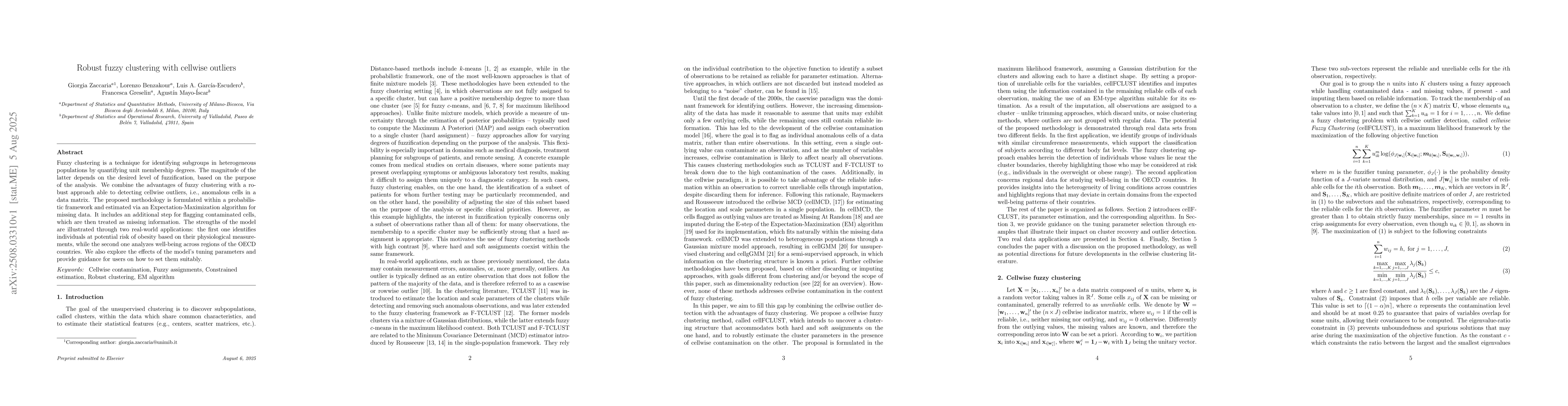 Fuzzy clustering is a technique for identifying subgroups in heterogeneous populations by quantifying unit membership degrees. The magnitude of the latter depends on the desired level of fuzzification, based on the purpose of the analysis. We combine the advantages of fuzzy clustering with a robust approach able to detecting cellwise outliers, i.e., anomalous cells in a data matrix. The proposed methodology is formulated within a probabilistic framework and estimated via an Expectation-Maximization algorithm for missing data. It includes an additional step for flagging contaminated cells, which are then treated as missing information. The strengths of the model are illustrated through two real-world applications: the first one identifies individuals at potential risk of obesity based on their physiological measurements, while the second one analyzes well-being across regions of the OECD countries. We also explore the effects of the model's tuning parameters and provide guidance for users on how to set them suitably.
