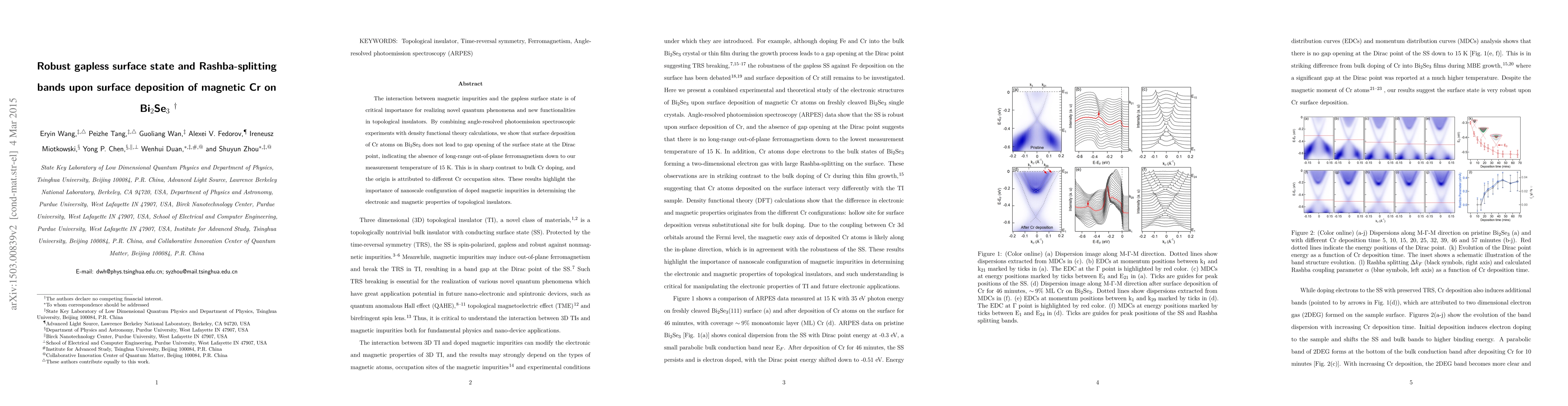 Research shows that Cr atoms deposited on Bi2Se3 surface do not open up a gap in its Dirac point, contradicting bulk Cr doping results, highlighting the importance of nanoscale configuration in determining electronic and magnetic properties.