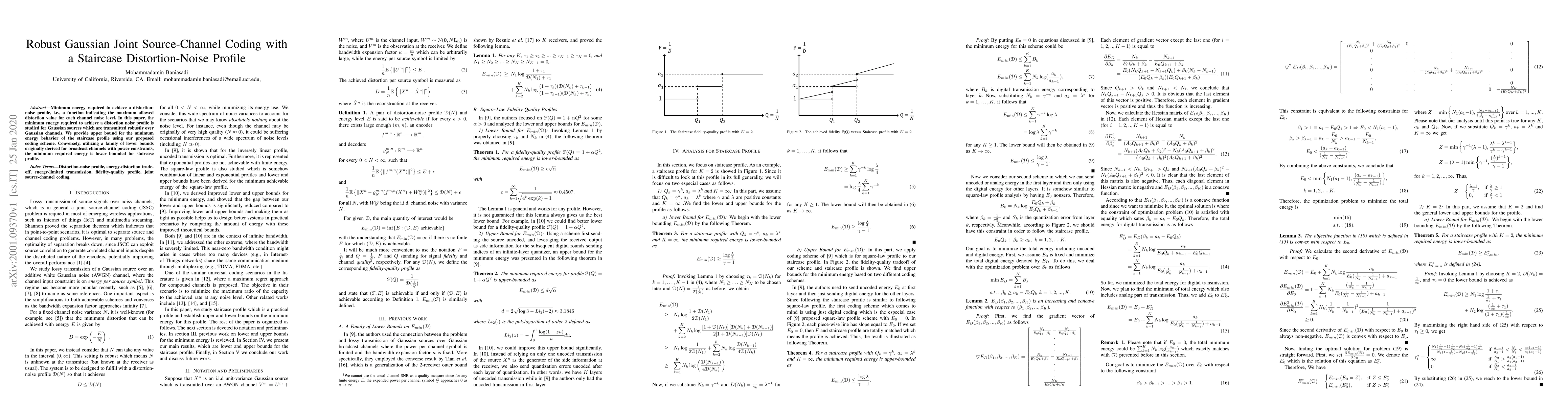 Minimum energy required to achieve a distortion-noise profile, i.e., a function indicating the maximum allowed distortion value for each channel noise level. In this paper, the minimum energy required to achieve a distortion noise profile is studied for Gaussian sources which are transmitted robustly over Gaussian channels. We provide upper bound for the minimum energy behavior of the staircase profile using our proposed coding scheme. Conversely, utilizing a family of lower bounds originally derived for broadcast channels with power constraints, the minimum required energy is lower bounded for staircase profile.
