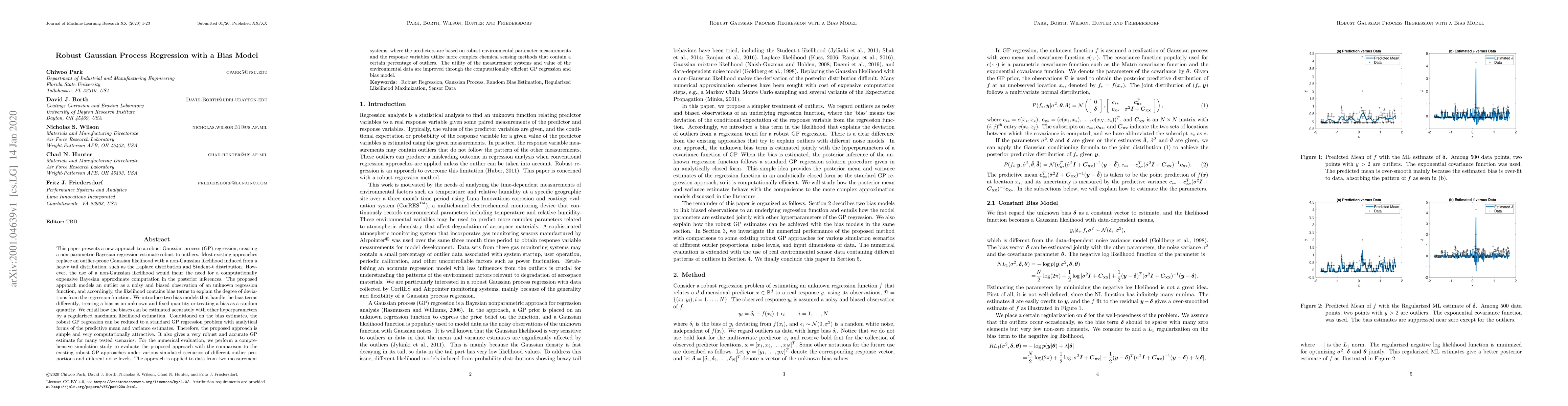 This paper presents a new approach to a robust Gaussian process (GP) regression. Most existing approaches replace an outlier-prone Gaussian likelihood with a non-Gaussian likelihood induced from a heavy tail distribution, such as the Laplace distribution and Student-t distribution. However, the use of a non-Gaussian likelihood would incur the need for a computationally expensive Bayesian approximate computation in the posterior inferences. The proposed approach models an outlier as a noisy and biased observation of an unknown regression function, and accordingly, the likelihood contains bias terms to explain the degree of deviations from the regression function. We entail how the biases can be estimated accurately with other hyperparameters by a regularized maximum likelihood estimation. Conditioned on the bias estimates, the robust GP regression can be reduced to a standard GP regression problem with analytical forms of the predictive mean and variance estimates. Therefore, the proposed approach is simple and very computationally attractive. It also gives a very robust and accurate GP estimate for many tested scenarios. For the numerical evaluation, we perform a comprehensive simulation study to evaluate the proposed approach with the comparison to the existing robust GP approaches under various simulated scenarios of different outlier proportions and different noise levels. The approach is applied to data from two measurement systems, where the predictors are based on robust environmental parameter measurements and the response variables utilize more complex chemical sensing methods that contain a certain percentage of outliers. The utility of the measurement systems and value of the environmental data are improved through the computationally efficient GP regression and bias model.