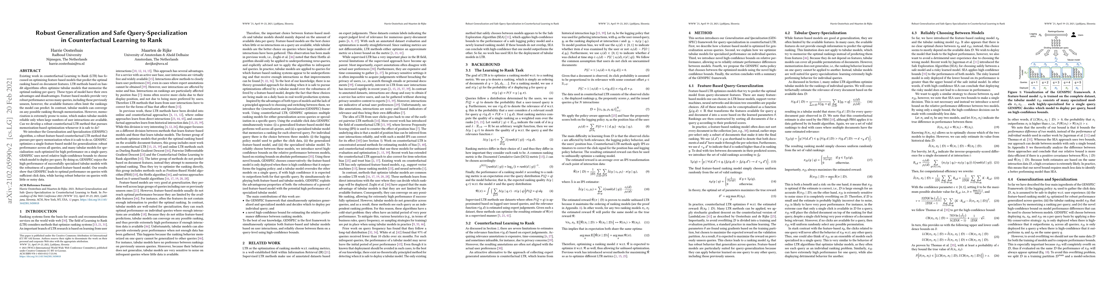 Existing work in counterfactual Learning to Rank (LTR) has focussed on optimizing feature-based models that predict the optimal ranking based on document features. LTR methods based on bandit algorithms often optimize tabular models that memorize the optimal ranking per query. These types of model have their own advantages and disadvantages. Feature-based models provide very robust performance across many queries, including those previously unseen, however, the available features often limit the rankings the model can predict. In contrast, tabular models can converge on any possible ranking through memorization. However, memorization is extremely prone to noise, which makes tabular models reliable only when large numbers of user interactions are available. Can we develop a robust counterfactual LTR method that pursues memorization-based optimization whenever it is safe to do? We introduce the Generalization and Specialization (GENSPEC) algorithm, a robust feature-based counterfactual LTR method that pursues per-query memorization when it is safe to do so. GENSPEC optimizes a single feature-based model for generalization: robust performance across all queries, and many tabular models for specialization: each optimized for high performance on a single query. GENSPEC uses novel relative high-confidence bounds to choose which model to deploy per query. By doing so, GENSPEC enjoys the high performance of successfully specialized tabular models with the robustness of a generalized feature-based model. Our results show that GENSPEC leads to optimal performance on queries with sufficient click data, while having robust behavior on queries with little or noisy data.