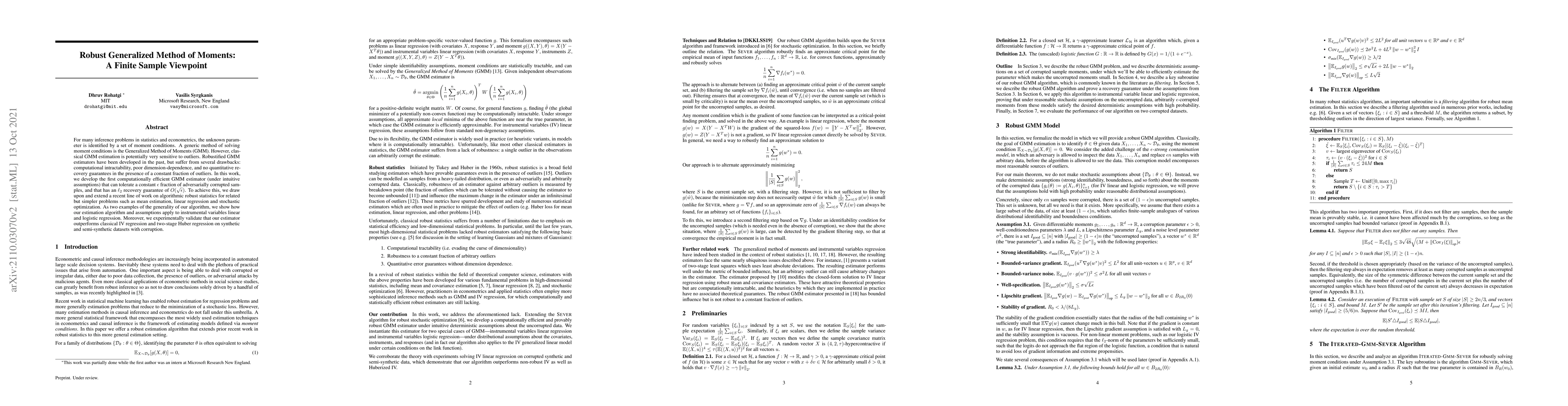 For many inference problems in statistics and econometrics, the unknown parameter is identified by a set of moment conditions. A generic method of solving moment conditions is the Generalized Method of Moments (GMM). However, classical GMM estimation is potentially very sensitive to outliers. Robustified GMM estimators have been developed in the past, but suffer from several drawbacks: computational intractability, poor dimension-dependence, and no quantitative recovery guarantees in the presence of a constant fraction of outliers. In this work, we develop the first computationally efficient GMM estimator (under intuitive assumptions) that can tolerate a constant $\epsilon$ fraction of adversarially corrupted samples, and that has an $\ell_2$ recovery guarantee of $O(\sqrt{\epsilon})$. To achieve this, we draw upon and extend a recent line of work on algorithmic robust statistics for related but simpler problems such as mean estimation, linear regression and stochastic optimization. As two examples of the generality of our algorithm, we show how our estimation algorithm and assumptions apply to instrumental variables linear and logistic regression. Moreover, we experimentally validate that our estimator outperforms classical IV regression and two-stage Huber regression on synthetic and semi-synthetic datasets with corruption.