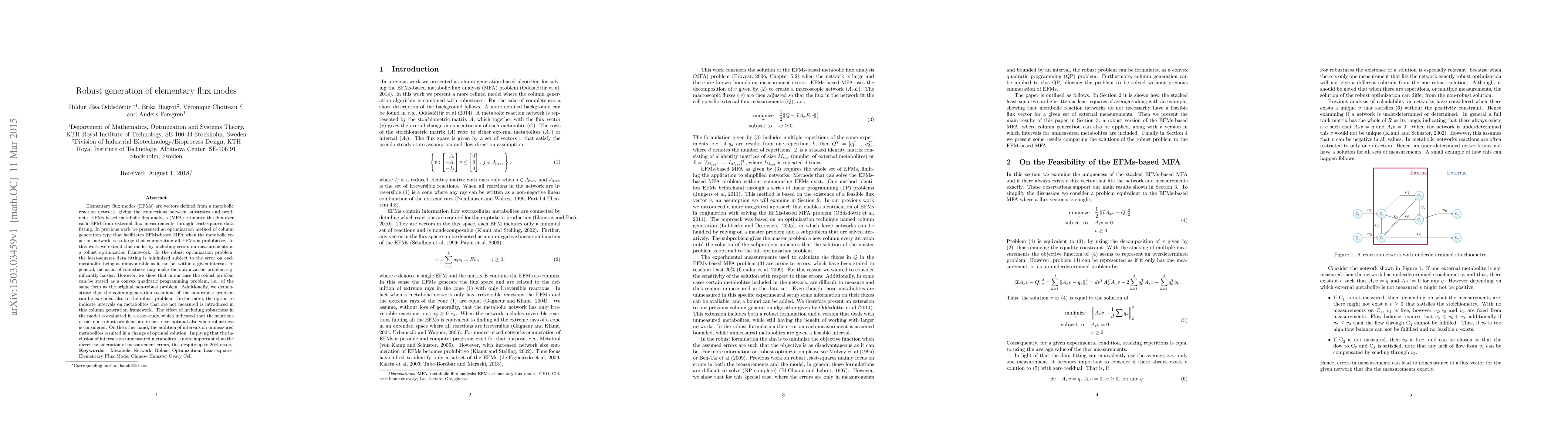 Elementary flux modes (EFMs) are vectors defined from a metabolic reaction network, giving the connections between substrates and products. EFMs-based metabolic flux analysis (MFA) estimates the flux over each EFM from external flux measurements through least-squares data fitting. In previous work we presented an optimization method of column generation type that facilitates EFMs-based MFA when the metabolic reaction network is so large that enumerating all EFMs is prohibitive. In this work we extend this model by including errors on measurements in a robust optimization framework. In the robust optimization problem, the least-squares data fitting is minimized subject to the error on each metabolite being as unfavourable as it can be, within a given interval. In general, inclusion of robustness may make the optimization problem significantly harder. However, we show that in our case the robust problem can be stated as a convex quadratic programming problem, i.e., of the same form as the original non-robust problem. Additionally, we demonstrate that the column-generation technique of the non-robust problem can be extended also to the robust problem. Furthermore, the option to indicate intervals on metabolites that are not measured is introduced in this column generation framework. The effect of including robustness in the model is evaluated in a case-study, which indicated that the solutions of our non-robust problems are in fact near-optimal also when robustness is considered. On the other hand, the addition of intervals on unmeasured metabolites resulted in a change of optimal solution. Implying that the inclusion of intervals on unmeasured metabolites is more important than the direct consideration of measurement errors, this despite up to 20% errors.