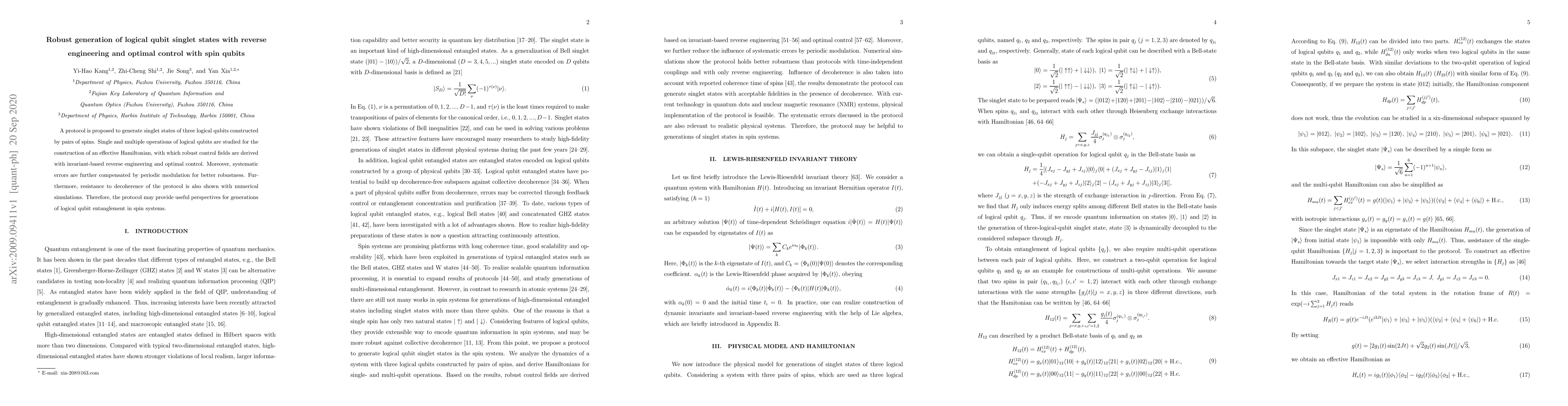 A protocol is proposed to generate singlet states of three logical qubits constructed by pairs of spins. Single and multiple operations of logical qubits are studied for the construction of an effective Hamiltonian, with which robust control fields are derived with invariant-based reverse engineering and optimal control. Moreover, systematic errors are further compensated by periodic modulation for better robustness. Furthermore, resistance to decoherence of the protocol is also shown with numerical simulations. Therefore, the protocol may provide useful perspectives for generations of logical qubit entanglement in spin systems.