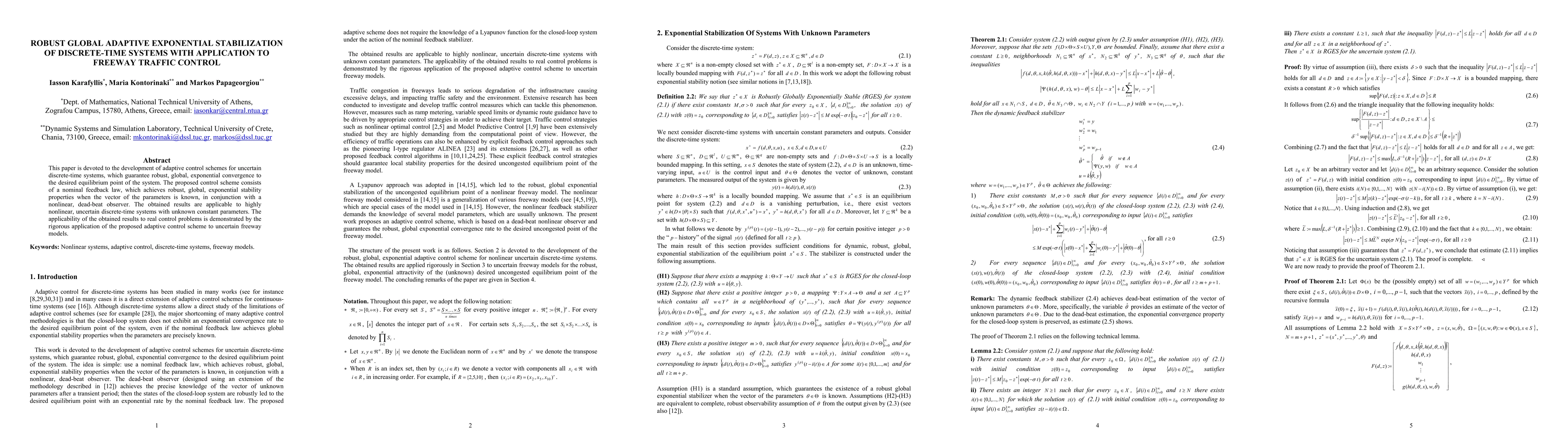 This paper develops adaptive control schemes for uncertain discrete-time systems ensuring robust global exponential stabilization, demonstrated through a nominal feedback law and a nonlinear observer. The method is applied to stabilize uncertain freeway traffic models, showcasing its practical applicability.