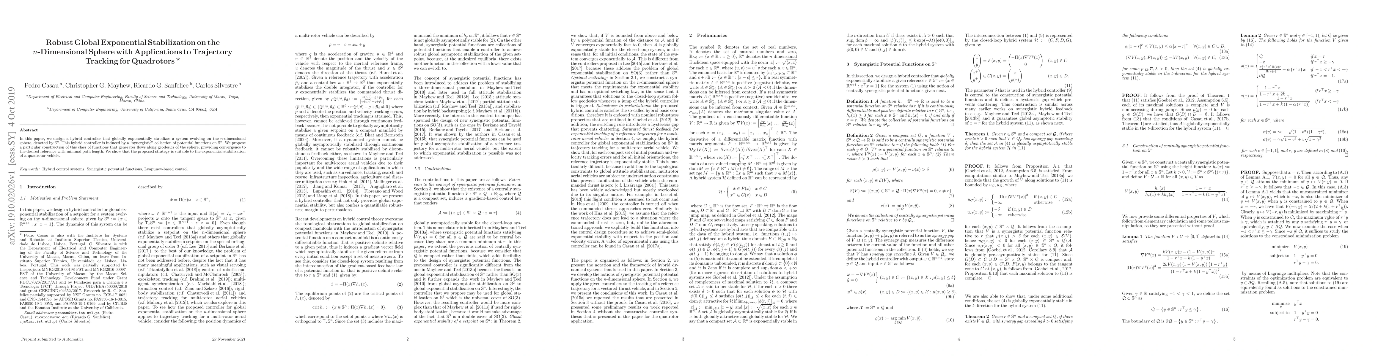 This paper designs a hybrid controller for global exponential stabilization on the n-dimensional sphere, utilizing potential functions that generate geodesic flows, and demonstrates its application in stabilizing quadrotor trajectory tracking.