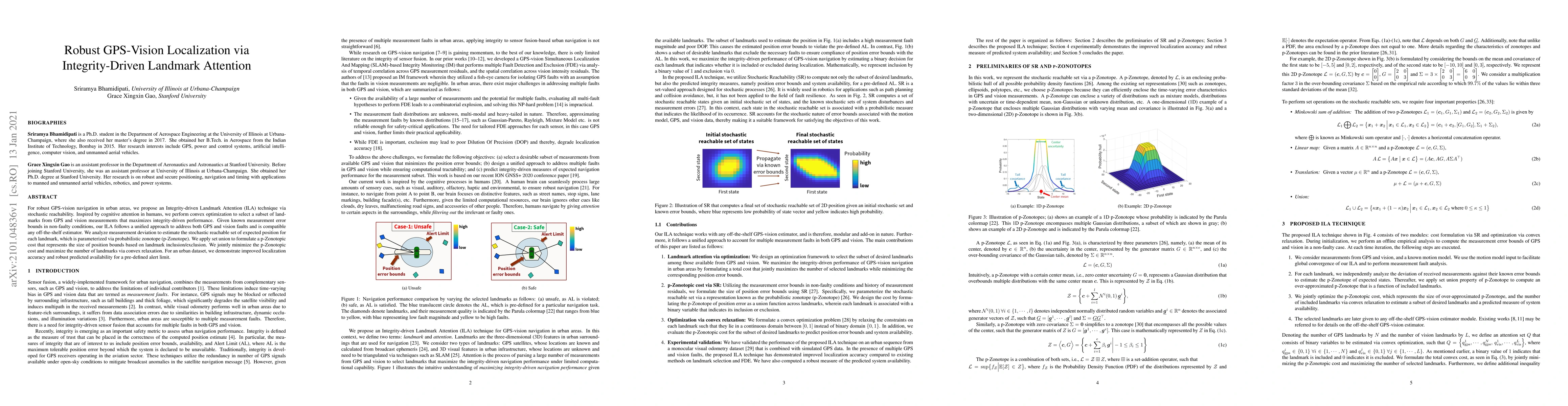 This paper proposes an Integrity-driven Landmark Attention (ILA) technique for robust GPS-vision localization in urban areas, using convex optimization to select optimal landmarks. The method estimates the stochastic reachable set of expected positions via probabilistic zonotopes, minimizing position bounds and maximizing landmark selection for improved localization accuracy.
