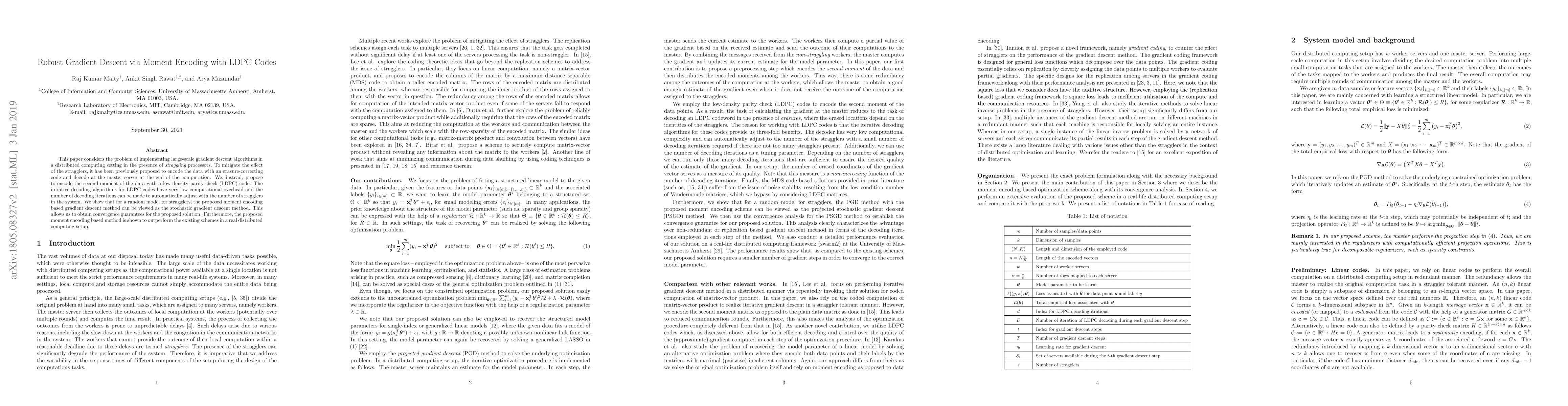This paper considers the problem of implementing large-scale gradient descent algorithms in a distributed computing setting in the presence of {\em straggling} processors. To mitigate the effect of the stragglers, it has been previously proposed to encode the data with an erasure-correcting code and decode at the master server at the end of the computation. We, instead, propose to encode the second-moment of the data with a low density parity-check (LDPC) code. The iterative decoding algorithms for LDPC codes have very low computational overhead and the number of decoding iterations can be made to automatically adjust with the number of stragglers in the system. We show that for a random model for stragglers, the proposed moment encoding based gradient descent method can be viewed as the stochastic gradient descent method. This allows us to obtain convergence guarantees for the proposed solution. Furthermore, the proposed moment encoding based method is shown to outperform the existing schemes in a real distributed computing setup.