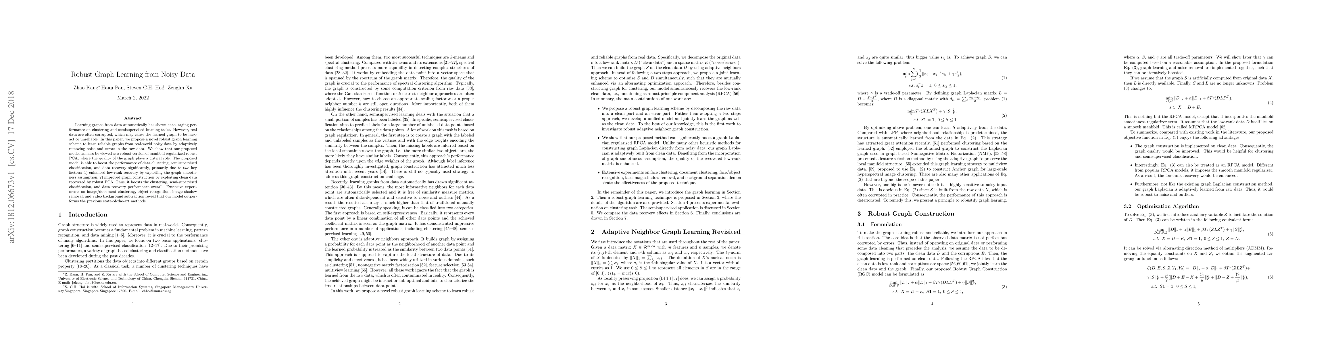This paper proposes a robust graph learning scheme to extract reliable graphs from noisy data by adaptively filtering noise, enhancing low-rank recovery through graph smoothness, and improving graph construction via clean data recovery. The model significantly boosts performance in clustering, semi-supervised classification, and data recovery tasks, outperforming previous methods in various applications.