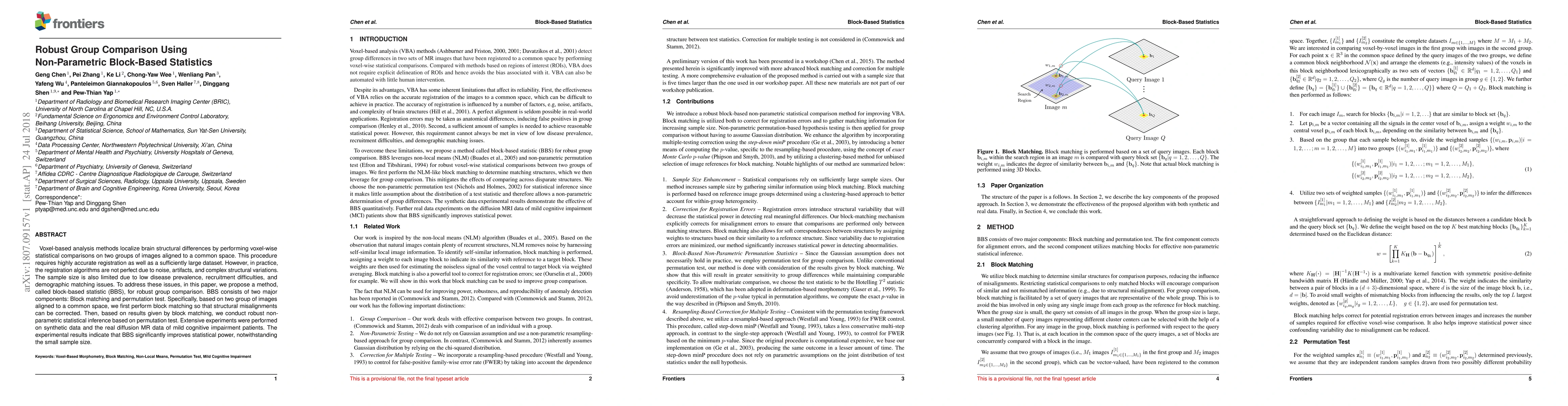 Voxel-based analysis methods localize brain structural differences by performing voxel-wise statistical comparisons on two groups of images aligned to a common space. This procedure requires highly accurate registration as well as a sufficiently large dataset. However, in practice, the registration algorithms are not perfect due to noise, artifacts, and complex structural variations. The sample size is also limited due to low disease prevalence, recruitment difficulties, and demographic matching issues. To address these issues, in this paper, we propose a method, called block-based statistic (BBS), for robust group comparison. BBS consists of two major components: Block matching and permutation test. Specifically, based on two group of images aligned to a common space, we first perform block matching so that structural misalignments can be corrected. Then, based on results given by block matching, we conduct robust non-parametric statistical inference based on permutation test. Extensive experiments were performed on synthetic data and the real diffusion MR data of mild cognitive impairment patients. The experimental results indicate that BBS significantly improves statistical power, notwithstanding the small sample size.