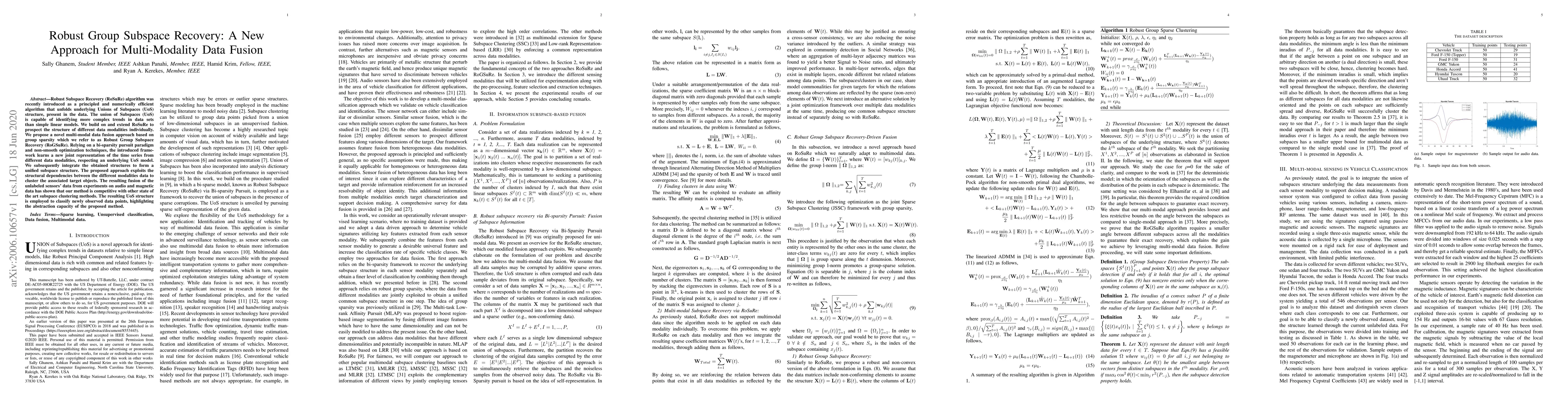 Robust Subspace Recovery (RoSuRe) algorithm was recently introduced as a principled and numerically efficient algorithm that unfolds underlying Unions of Subspaces (UoS) structure, present in the data. The union of Subspaces (UoS) is capable of identifying more complex trends in data sets than simple linear models. We build on and extend RoSuRe to prospect the structure of different data modalities individually. We propose a novel multi-modal data fusion approach based on group sparsity which we refer to as Robust Group Subspace Recovery (RoGSuRe). Relying on a bi-sparsity pursuit paradigm and non-smooth optimization techniques, the introduced framework learns a new joint representation of the time series from different data modalities, respecting an underlying UoS model. We subsequently integrate the obtained structures to form a unified subspace structure. The proposed approach exploits the structural dependencies between the different modalities data to cluster the associated target objects. The resulting fusion of the unlabeled sensors' data from experiments on audio and magnetic data has shown that our method is competitive with other state of the art subspace clustering methods. The resulting UoS structure is employed to classify newly observed data points, highlighting the abstraction capacity of the proposed method.