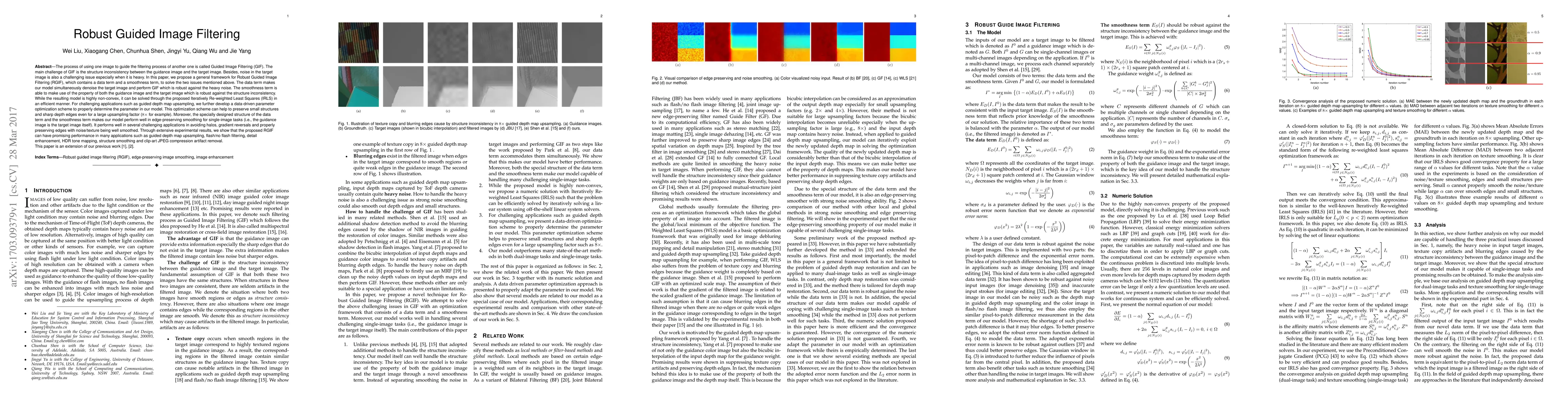 This paper proposes a Robust Guided Image Filtering (RGIF) framework to address inconsistencies between guidance and target images and heavy noise in the target image. The RGIF model combines a data term for denoising and GIF, and a smoothness term for handling structural inconsistencies, solved efficiently via Iteratively Re-weighted Least Squares (IRLS). An additional optimization scheme is developed for applications like guided depth map upsampling to preserve small structures and sharp edges.