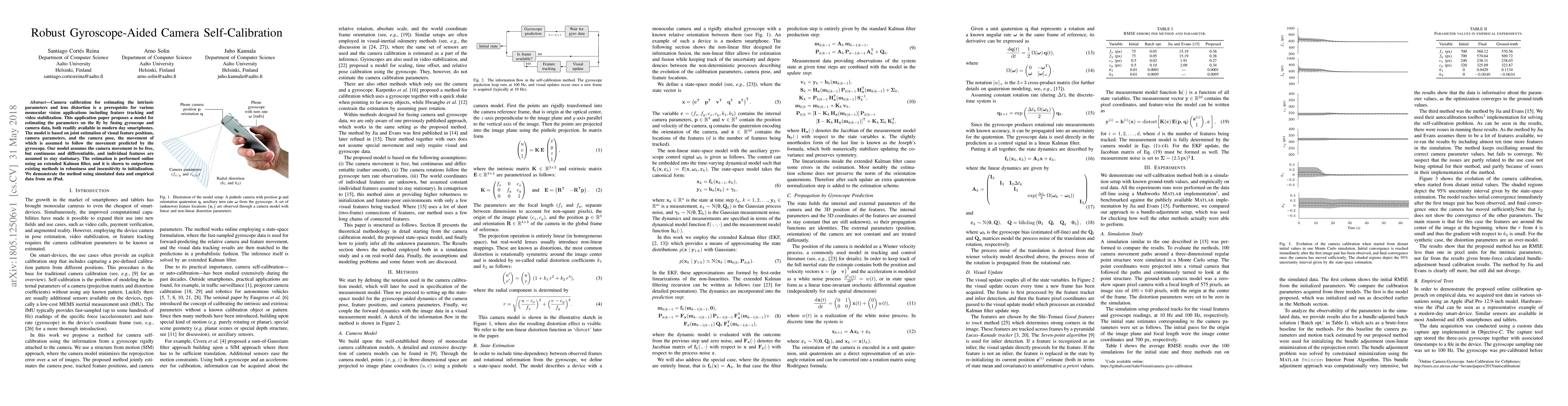This paper proposes a gyroscope-aided camera self-calibration model that fuses gyroscope and camera data to estimate intrinsic parameters, lens distortion, and camera pose in real-time. The method outperforms existing techniques in robustness and initialization insensitivity, demonstrated through both simulated and real data from an iPad.
