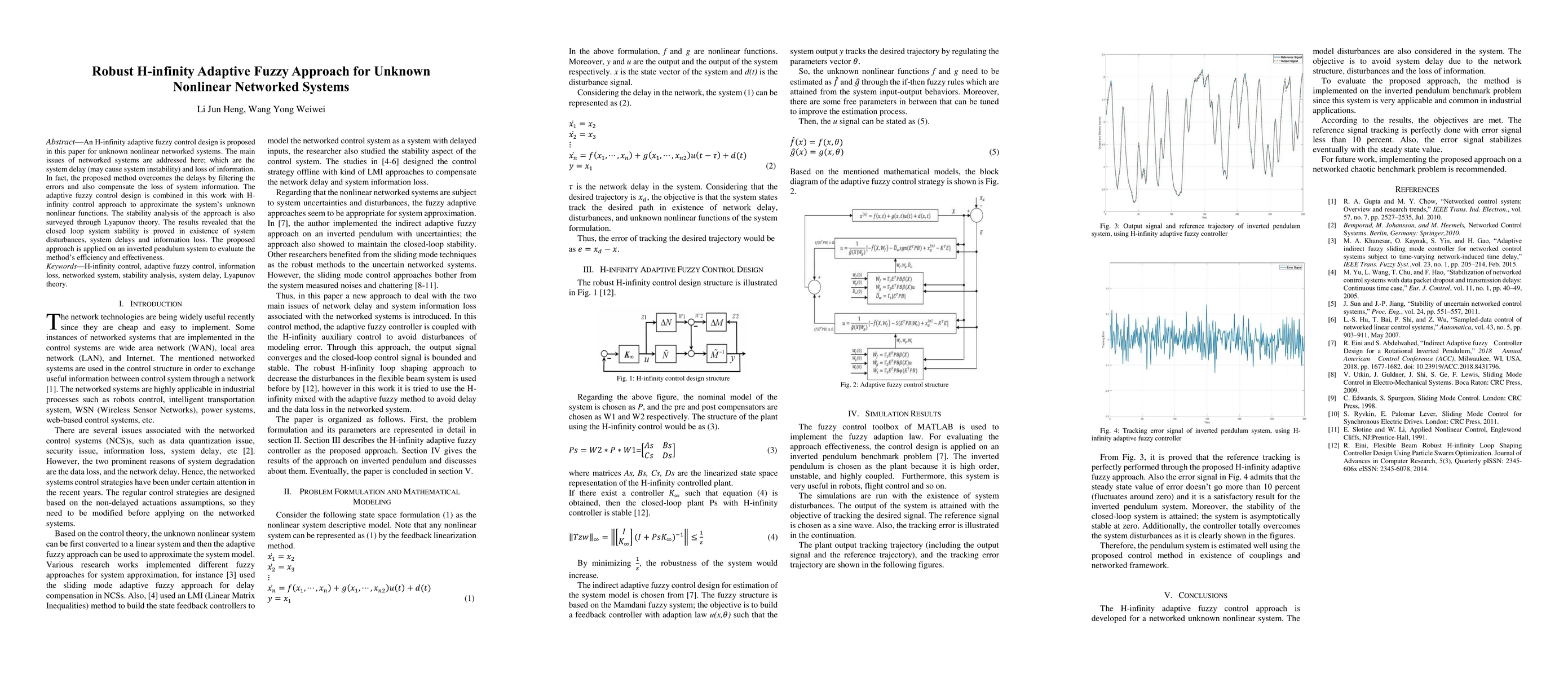 This paper proposes an H-infinity adaptive fuzzy control design for unknown nonlinear networked systems, addressing delays and information loss through error filtering and compensation. The stability analysis confirms the closed-loop system's stability under disturbances, delays, and information loss, validated through an inverted pendulum system.