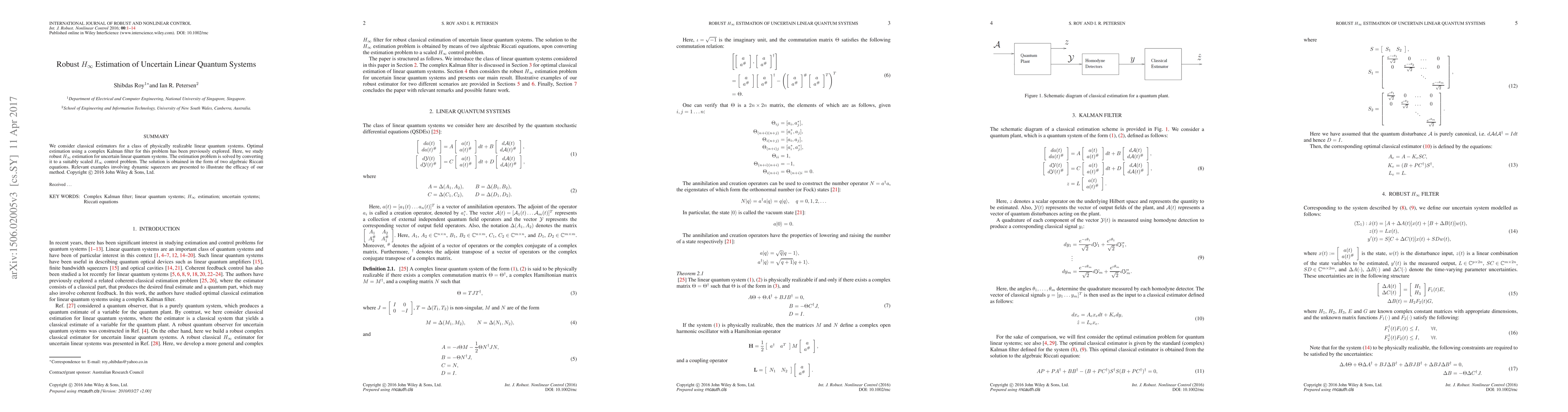 This paper explores robust $H_\infty$ estimation for uncertain linear quantum systems, solving the problem by converting it to a scaled $H_\infty$ control problem and obtaining solutions via two algebraic Riccati equations, with dynamic squeezers used to demonstrate the method's effectiveness.