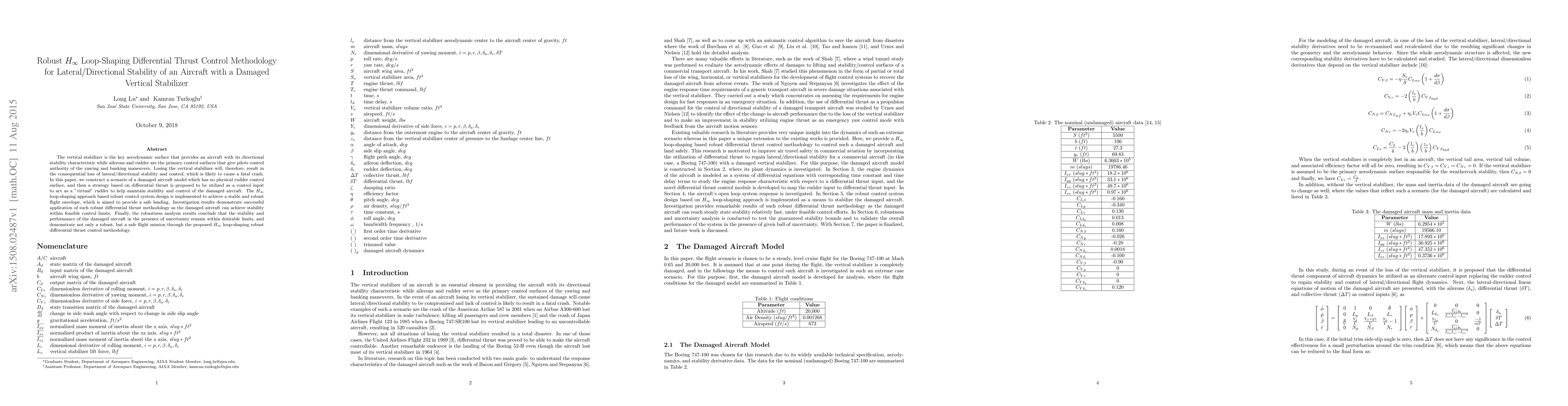 The vertical stabilizer is the key aerodynamic surface that provides an aircraft with its directional stability characteristic while ailerons and rudder are the primary control surfaces that give pilots control authority of the yawing and banking maneuvers. Losing the vertical stabilizer will, therefore, result in the consequential loss of lateral/directional stability and control, which is likely to cause a fatal crash. In this paper, we construct a scenario of a damaged aircraft model which has no physical rudder control surface, and then a strategy based on differential thrust is proposed to be utilized as a control input to act as a "virtual" rudder to help maintain stability and control of the damaged aircraft. The $H_{\infty}$ loop-shaping approach based robust control system design is implemented to achieve a stable and robust flight envelope, which is aimed to provide a safe landing. Investigation results demonstrate successful application of such robust differential thrust methodology as the damaged aircraft can achieve stability within feasible control limits. Finally, the robustness analysis results conclude that the stability and performance of the damaged aircraft in the presence of uncertainty remain within desirable limits, and demonstrate not only a robust, but a safe flight mission through the proposed $H_{\infty}$ loop-shaping robust differential thrust control methodology.