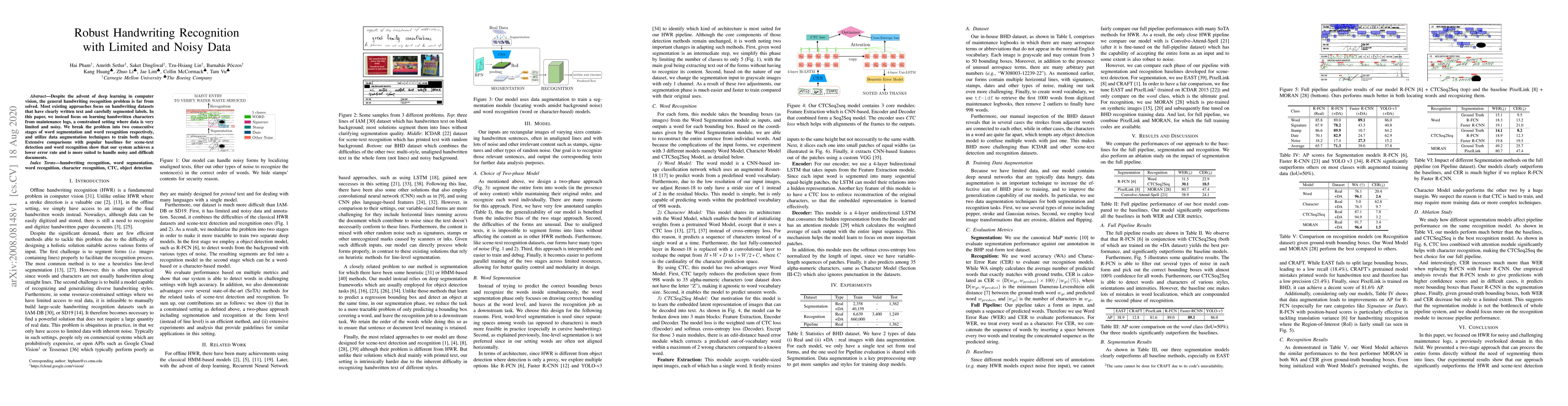 Despite the advent of deep learning in computer vision, the general handwriting recognition problem is far from solved. Most existing approaches focus on handwriting datasets that have clearly written text and carefully segmented labels. In this paper, we instead focus on learning handwritten characters from maintenance logs, a constrained setting where data is very limited and noisy. We break the problem into two consecutive stages of word segmentation and word recognition respectively and utilize data augmentation techniques to train both stages. Extensive comparisons with popular baselines for scene-text detection and word recognition show that our system achieves a lower error rate and is more suited to handle noisy and difficult documents