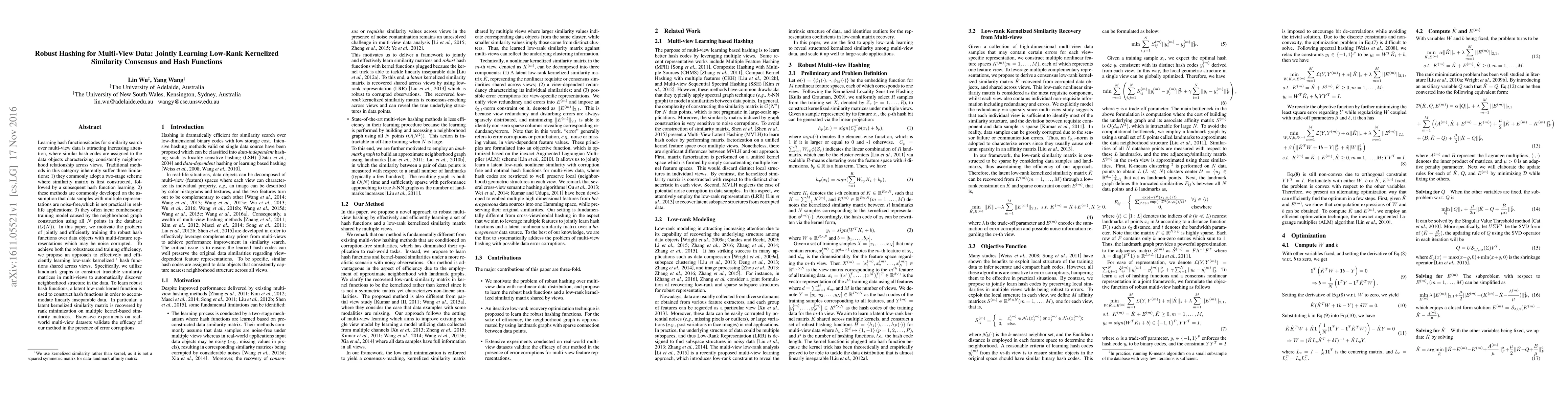 This paper proposes a method for robust hashing over multi-view data by jointly learning low-rank kernelized similarity consensus and hash functions, addressing the limitations of traditional two-stage schemes and noise-free assumptions. The approach uses landmark graphs to construct efficient similarity matrices and latent low-rank kernel functions to handle noise and linearly inseparable data.
