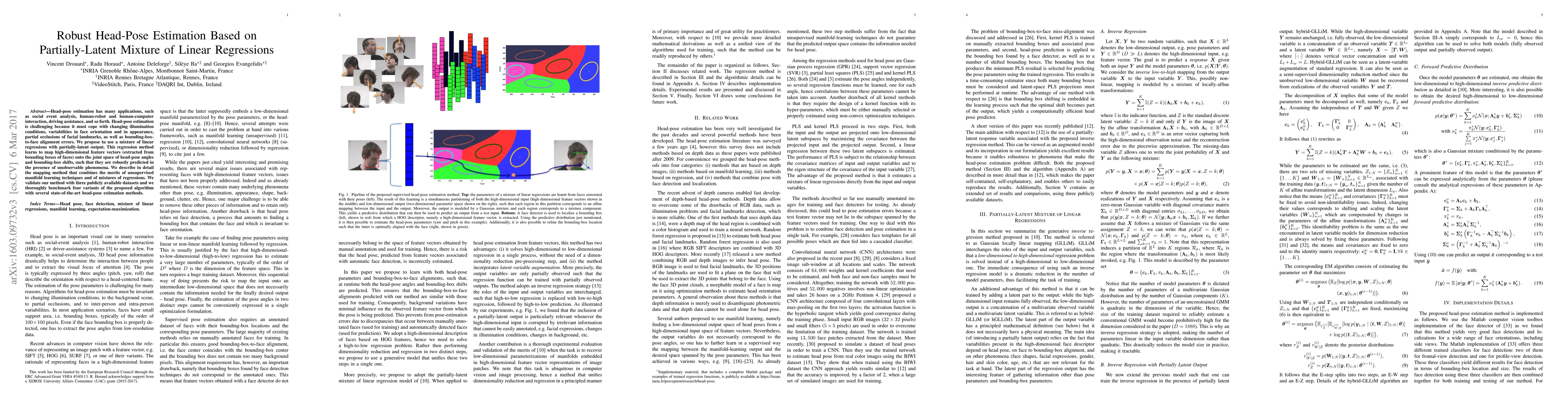 This paper proposes a robust head-pose estimation method using a mixture of linear regressions with partially-latent output, which maps high-dimensional face features to head-pose angles and bounding-box shifts. The method is validated against three datasets and outperforms several state-of-the-art techniques.