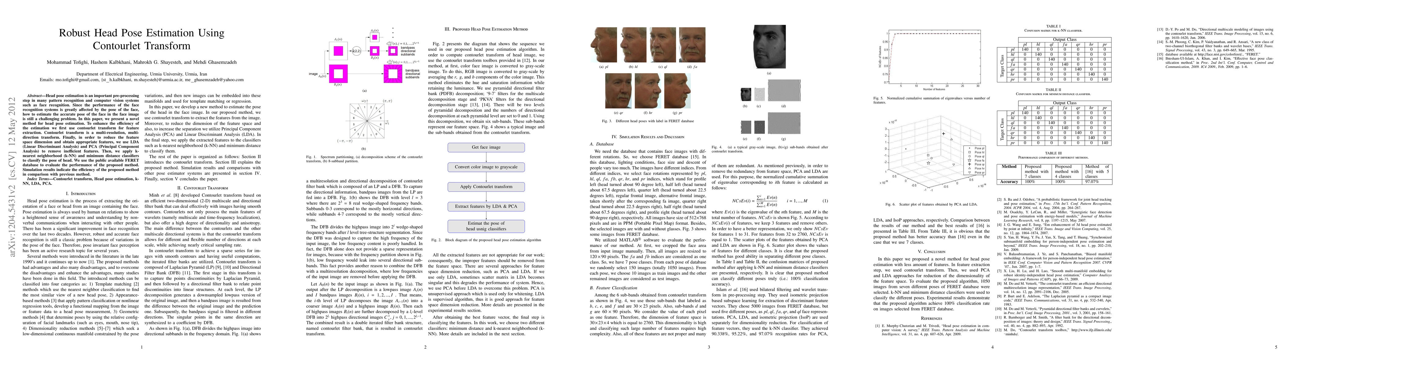 This paper proposes a novel method for robust head pose estimation using contourlet transform for feature extraction, followed by dimensionality reduction via LDA and PCA. The method is evaluated on the FERET database, demonstrating superior robustness compared to existing methods.