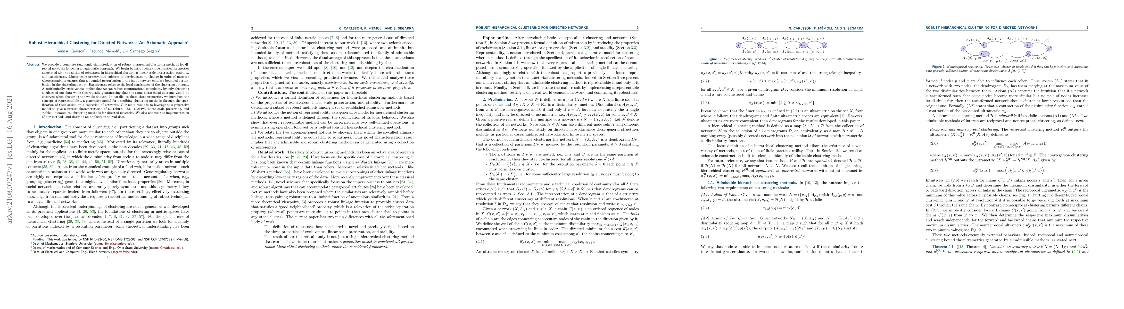 This paper characterizes robust hierarchical clustering methods for directed networks through an axiomatic framework, introducing properties like linear scale preservation, stability, and excisiveness. The authors develop a generative model termed representability to precisely define all robust clustering methods, and discuss their implementation and application to real-world data.