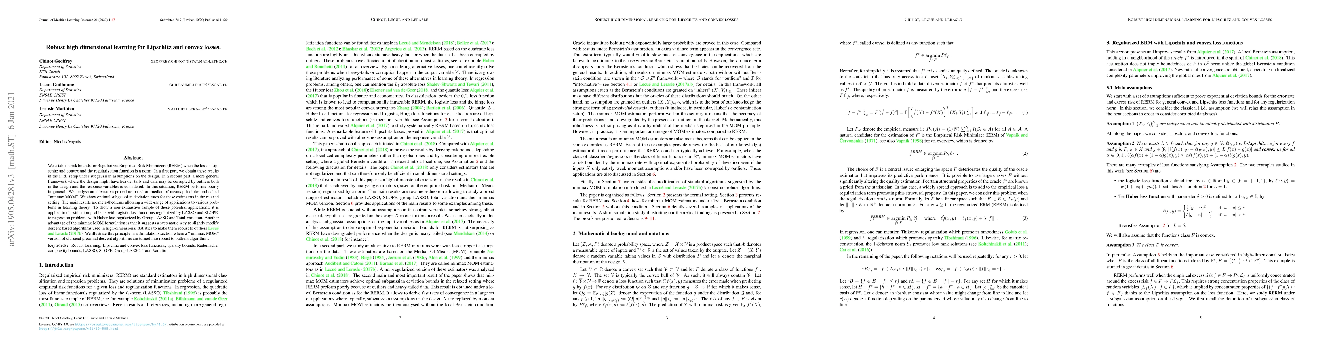 This research establishes risk bounds for Regularized Empirical Risk Minimizers (RERM) under Lipschitz and convex loss functions with norm regularization. It covers both i.i.d. setups with subgaussian design assumptions and more general settings with heavier-tailed designs and outlier corruption in data. The paper introduces minmax MOM, an outlier-resistant alternative to RERM, demonstrating optimal subgaussian deviation rates. Applications to various learning problems like classification and regression are discussed, alongside suggesting modifications to descent-based algorithms for robustness to outliers.