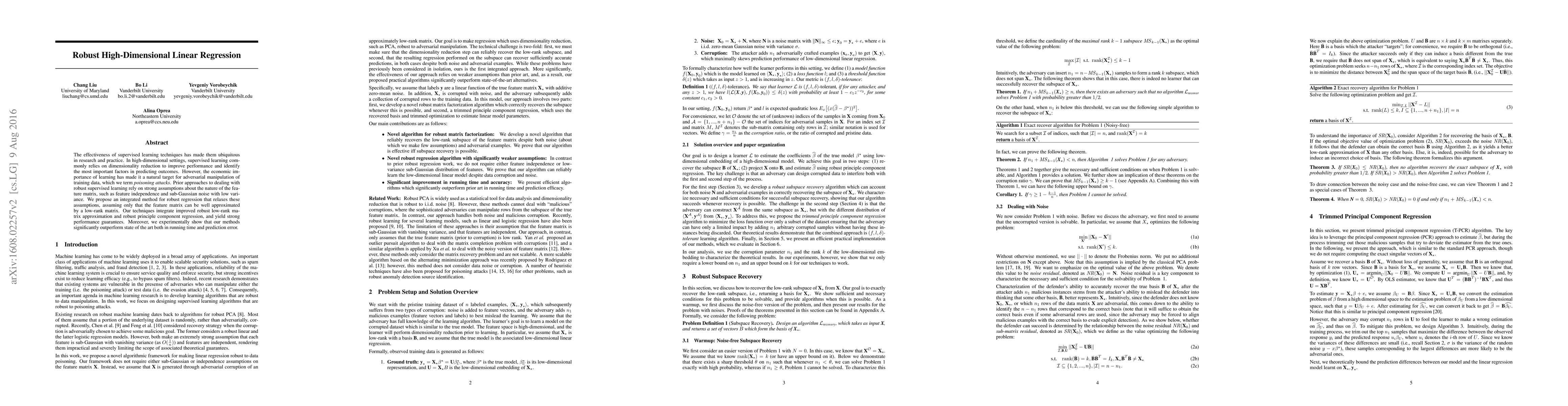 The effectiveness of supervised learning techniques has made them ubiquitous in research and practice. In high-dimensional settings, supervised learning commonly relies on dimensionality reduction to improve performance and identify the most important factors in predicting outcomes. However, the economic importance of learning has made it a natural target for adversarial manipulation of training data, which we term poisoning attacks. Prior approaches to dealing with robust supervised learning rely on strong assumptions about the nature of the feature matrix, such as feature independence and sub-Gaussian noise with low variance. We propose an integrated method for robust regression that relaxes these assumptions, assuming only that the feature matrix can be well approximated by a low-rank matrix. Our techniques integrate improved robust low-rank matrix approximation and robust principle component regression, and yield strong performance guarantees. Moreover, we experimentally show that our methods significantly outperform state of the art both in running time and prediction error.